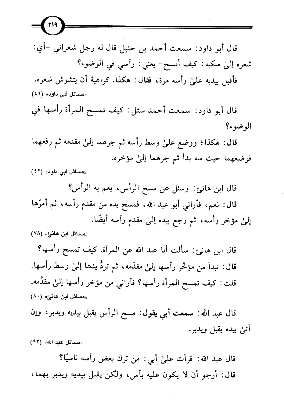 قال أبو داود: سمعت أحمد سئل: كيف تمسح المرأة رأسها في الوضوء؟