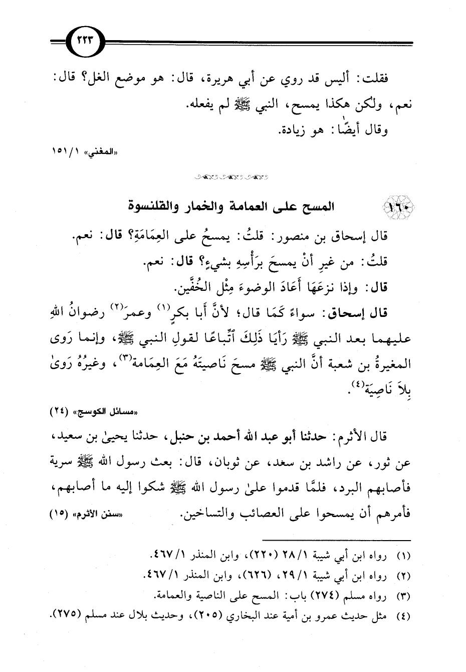 قال إسحاق بن منصور: قلتُ: يمسحُ على العِمَامَةِ؟ قال: نعم.