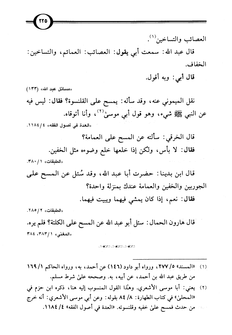 (¬2) يعني: أبا موسى الأشعري. وهذا القول المنسوب إليه هنا، ذكره ابن حزم في "المحلى" في كتاب الطهارة: 8/ 84 بقوله: وعن أبي موسى الأشعري: أنه خرج من حدث فمسح على خفيه وقلنسوته. "العدة في أصول الفقه" 4/ 1184.