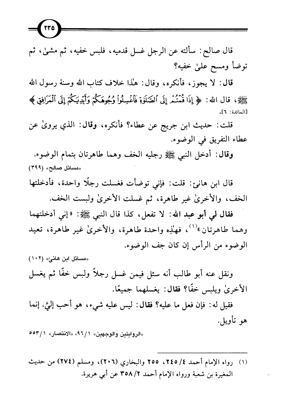(¬1) رواه الإمام أحمد 4/ 245، 255 والبخاري (206)، ومسلم (274) من حديث المغيرة بن شعبة ورواه الإمام أحمد 2/ 358 عن أبي هريرة.