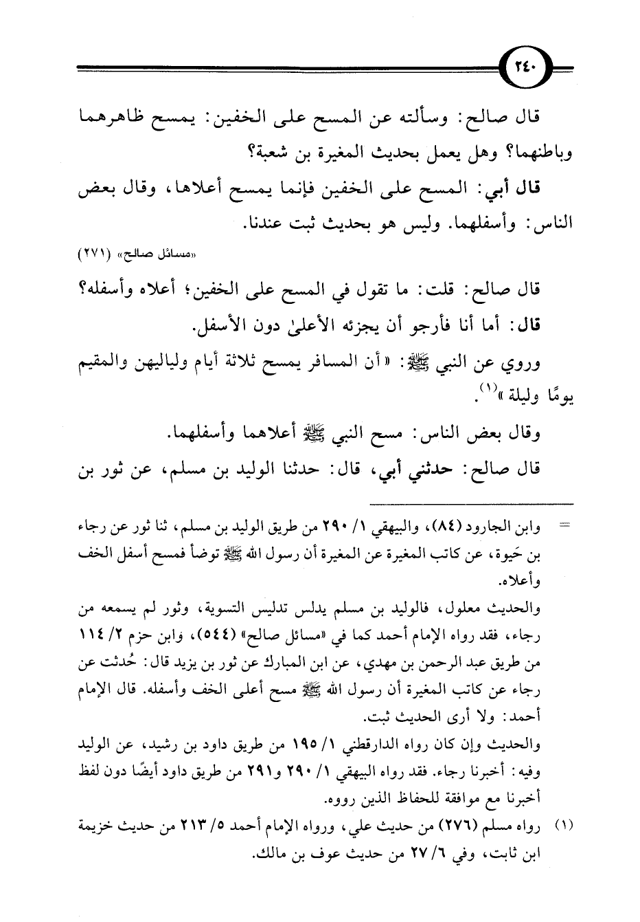 قال صالح: وسألته عن المسح على الخفين: يمسح ظاهرهما وباطنهما؟ وهل يعمل بحديث المغيرة بن شعبة؟