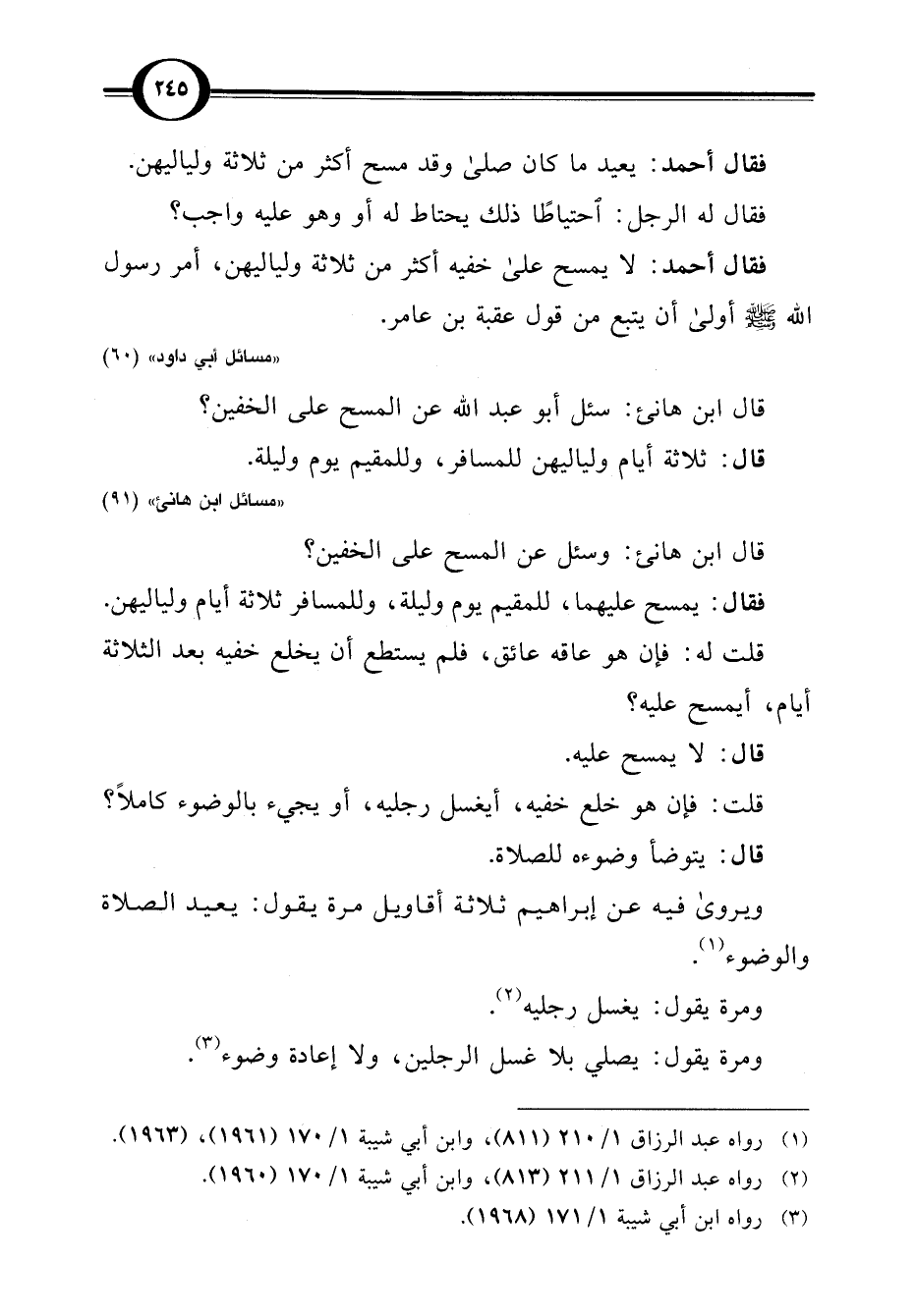 فقال أحمد: لا يمسح على خفيه أكثر من ثلاثة ولياليهن، أمر لرسول اللَّه -صلى اللَّه عليه وسلم- أولى أن يتبع من قول عقبة بن عامر.
