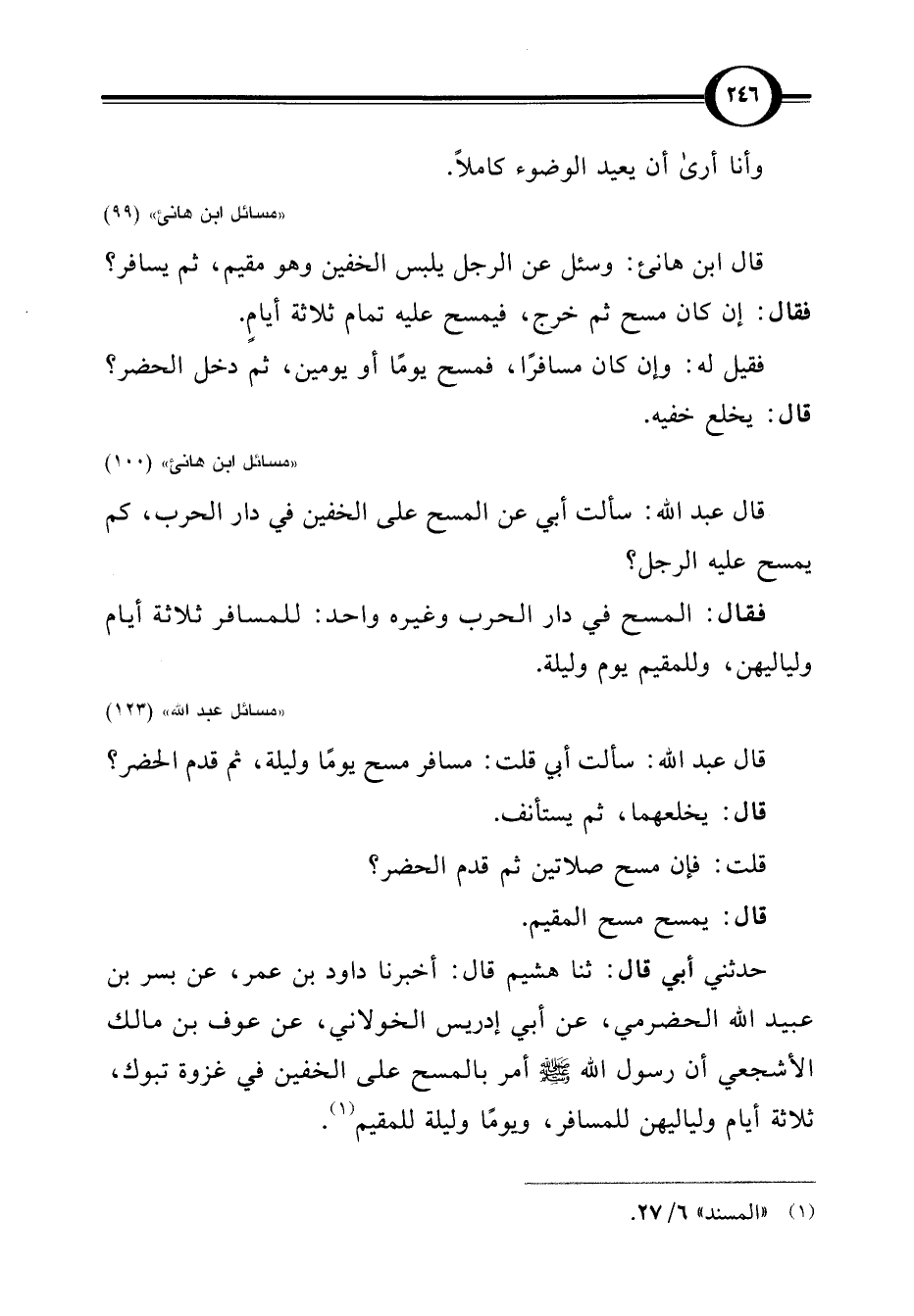 حدثني أبي قال: ثنا هشيم قال: أخبرنا داود بن عمر، عن بسر بن عبيد اللَّه الحضرمي، عن أبي إدريس الخولاني، عن عوف بن مالك الأشجعي أن رسول اللَّه -صلى اللَّه عليه وسلم- أمر بالمسح على الخفين في غزوة تبوك، ثلاثة أيام ولياليهن للمسافر، ويومًا وليلة للمقيم (¬1).