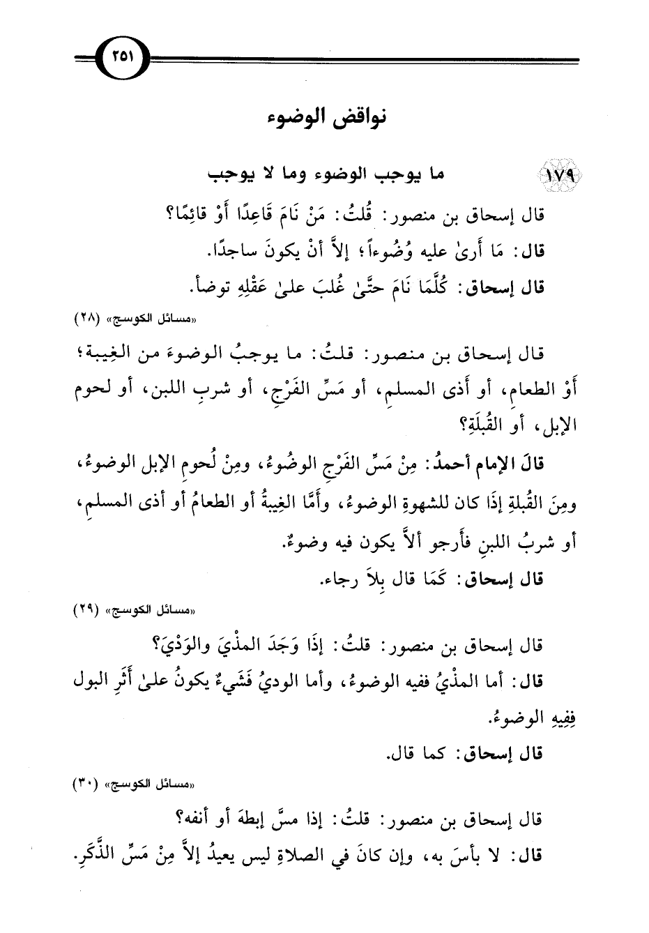 قال إسحاق بن منصور: قلتُ: ما يوجبُ الوضوءَ من الغِيبة؛ أَوْ الطعامِ، أو أَذى المسلمِ، أو مَسِّ الفَرْجِ، أو شربِ اللبن، أو لحوم الإبل، أو القُبلَةِ؟