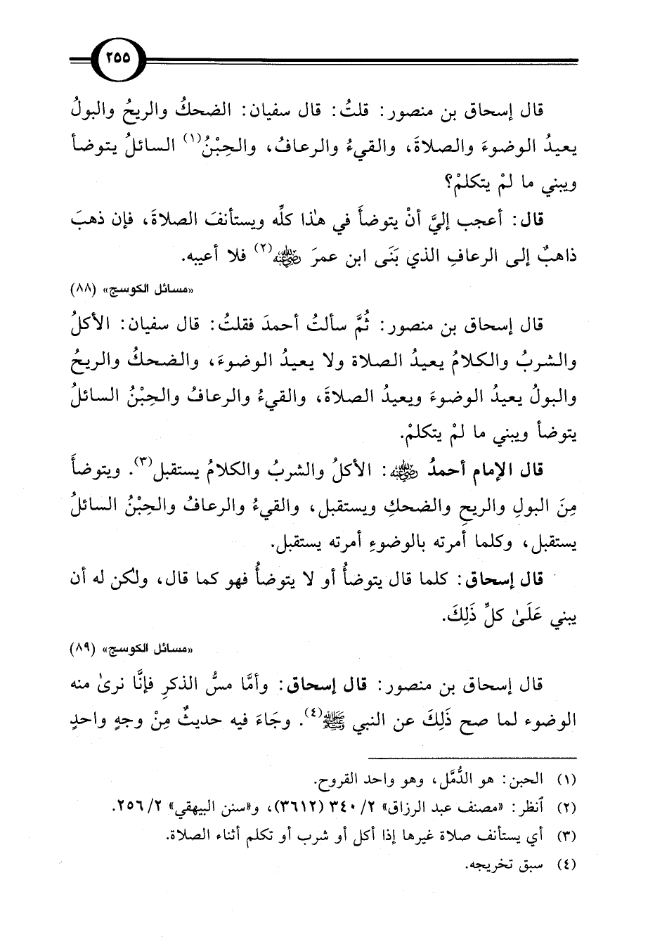 قال إسحاق بن منصور: ثُمَّ سألتُ أحمدَ فقلتُ: قال سفيان: الأكلُ والشربُ والكلامُ يعيدُ الصلاة ولا يعيدُ الوضوءَ، والضحكُ والريحُ والبولُ يعيدُ الوضوءَ ويعيدُ الصلاةَ، والقيءُ والرعافُ والحِبْنُ السائلُ يتوضأ ويبني ما لمْ يتكلمْ.