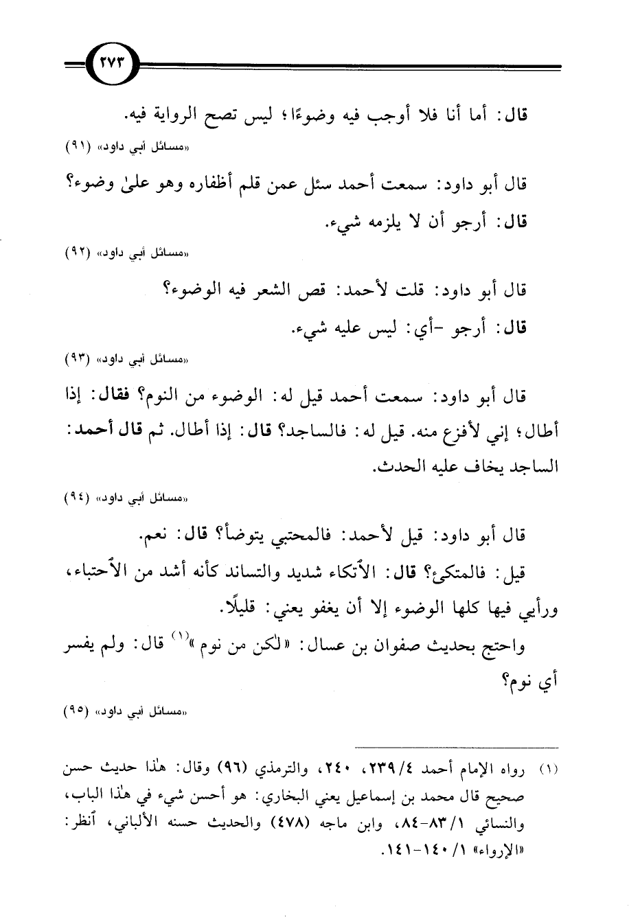 قال أبو داود: سمعت أحمد قيل له: الوضوء من النوم؟ فقال: إذا أطال؛ إني لأفزع منه. قيل له: فالساجد؟ قال: إذا أطال. ثم قال أحمد: الساجد يخاف عليه الحدث.