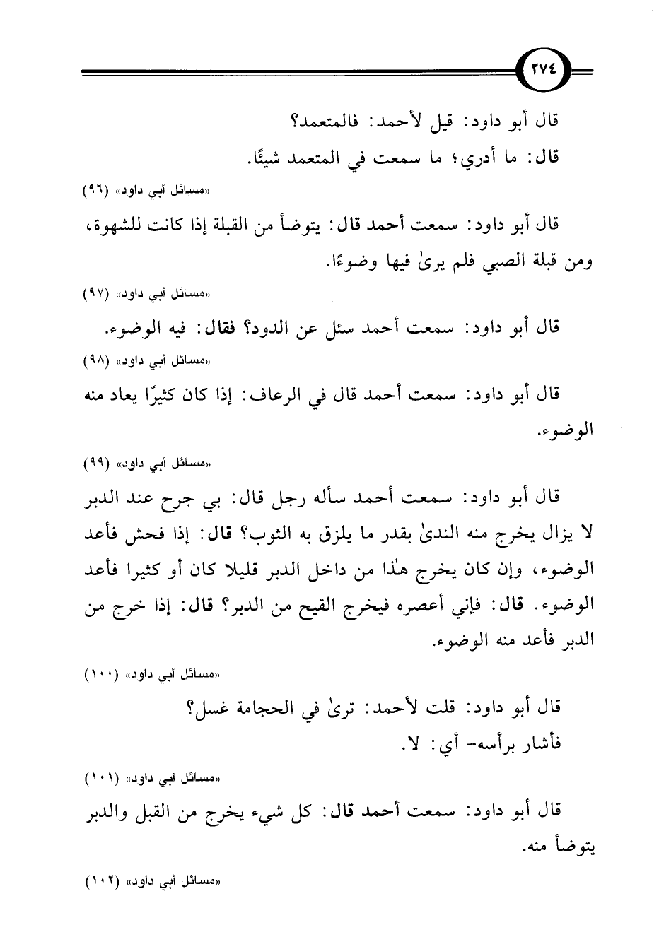 قال أبو داود: سمعت أحمد سأله رجل قال: بي جرح عند الدبر لا يزال يخرج منه الندى بقدر ما يلزق به الثوب؟ قال: إذا فحش فأعد الوضوء، وإن كان يخرج هذا من داخل الدبر قليلا كان أو كثيرا فأعد الوضوء. قال: فإني أعصره فيخرج القيح من الدبر؟ قال: إذا خرج من الدبر فأعد منه الوضوء.