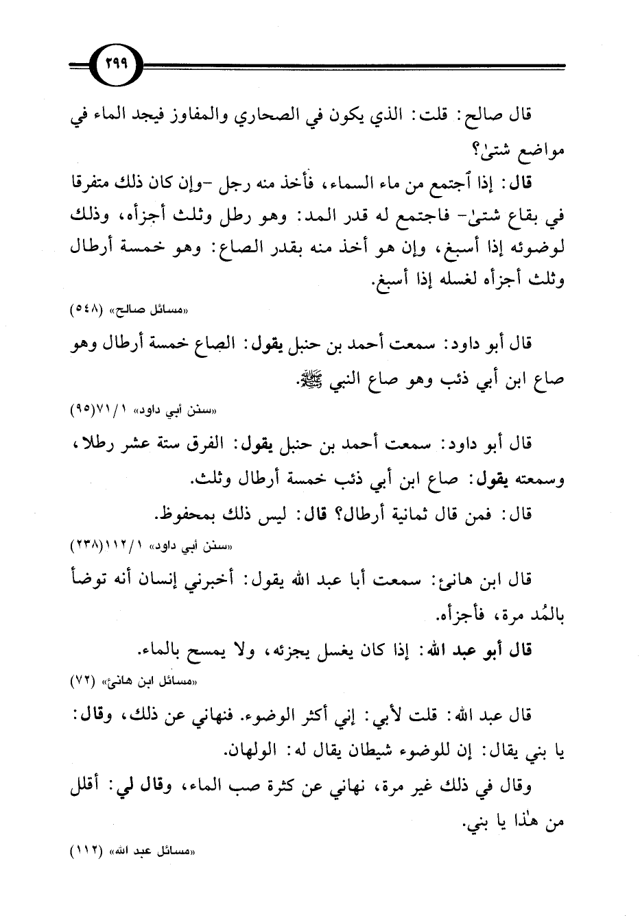 قال أبو داود: سمعت أحمد بن حنبل يقول: الصاع خمسة أرطال وهو صاع ابن أبي ذئب وهو صاع النبي -صلى اللَّه عليه وسلم-.