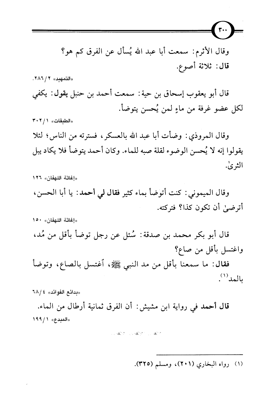 قال أبو يعقوب إسحاق بن حية: سمعت أحمد بن حنبل يقول: يكفي لكل عضو غرفة من ماءٍ لمن يُحسن يتوضأ.