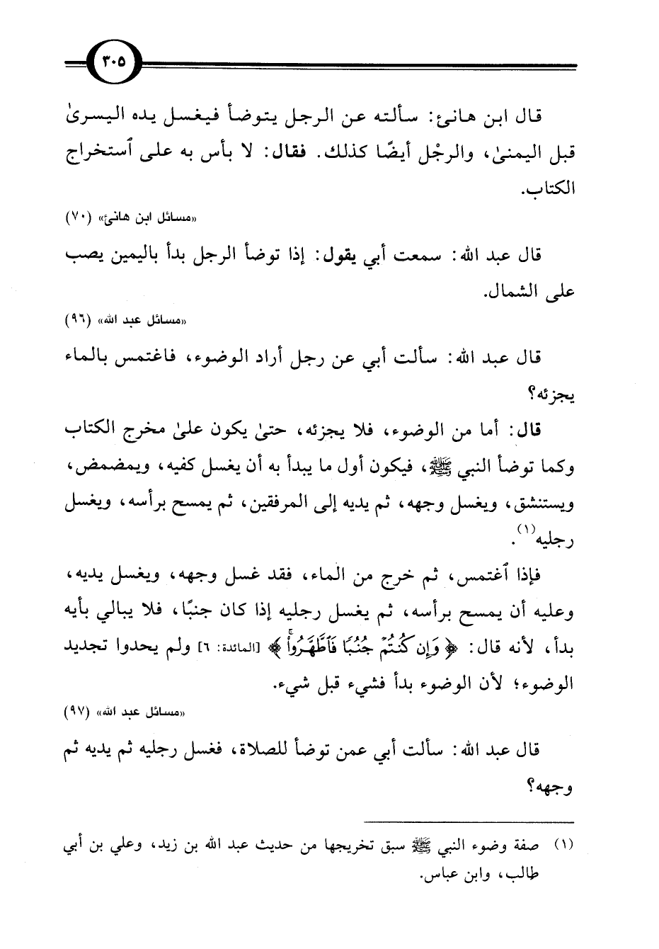 قال ابن هانئ: سألته عن الرجل يتوضأ فيغسل يده اليسرى قبل اليمنى، والرجْل أيضًا كذلك. فقال: لا بأس به على استخراج الكتاب.