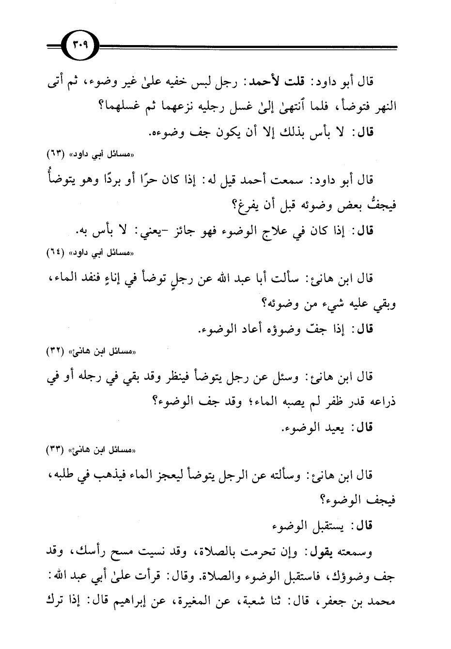 قال أبو داود: سمعت أحمد قيل له: إذا كان حرًا أو بردًا وهو يتوضأُ فيجفُّ بعض وضوئه قبل أن يفرغ؟