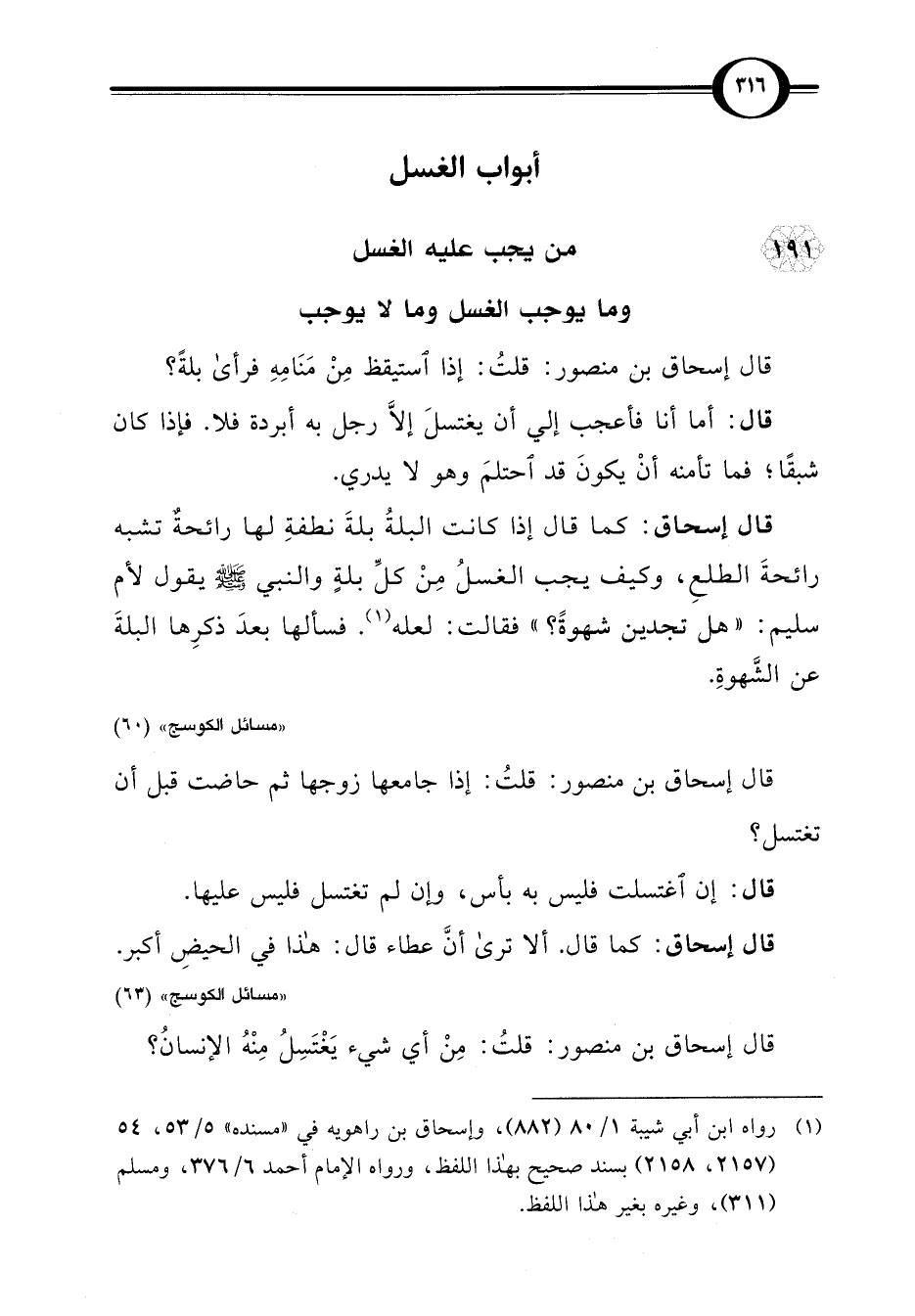 قال إسحاق بن منصور: قلتُ: مِنْ أي شيء يَغْتَسِلُ مِنْهُ الإنسانُ؟