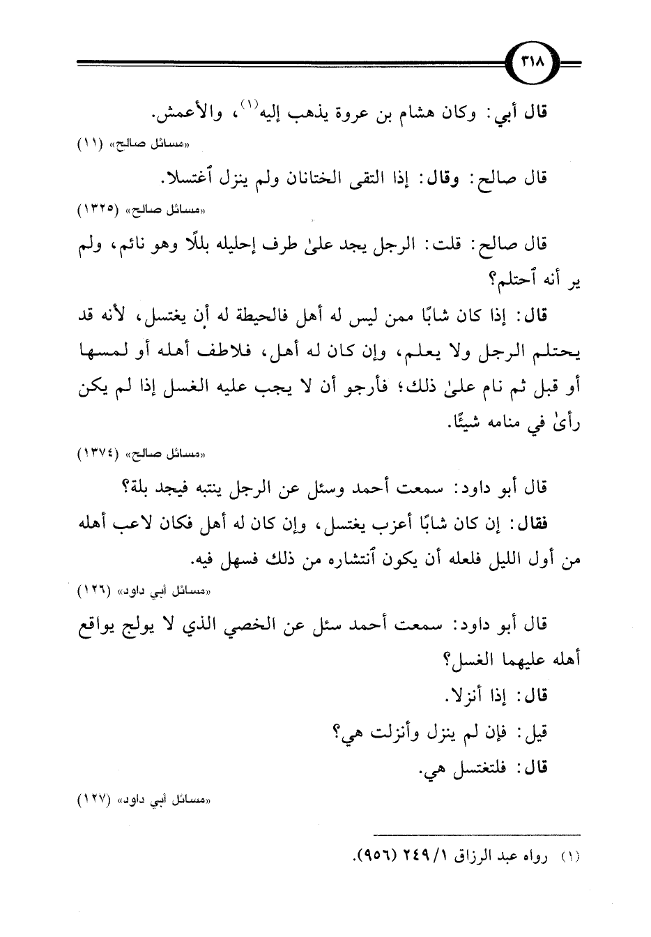 قال صالح: قلت: الرجل يجد على طرف إحليله بللًا وهو نائم، ولم ير أنه احتلم؟