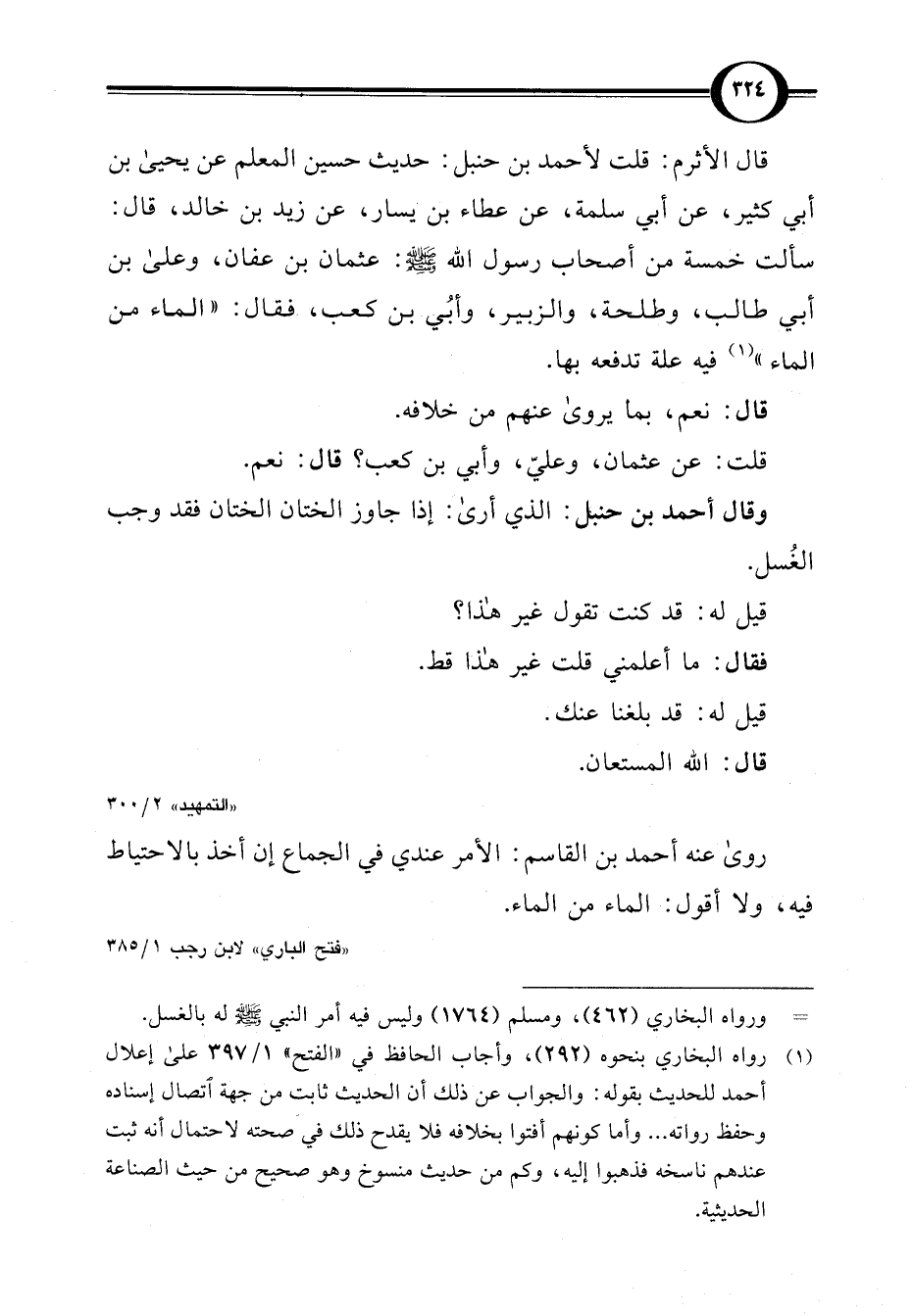قال الأثرم: قلت لأحمد بن حنبل: حديث حسين المعلم عن يحيى بن أبي كثير، عن أبي سلمة، عن عطاء بن يسار، عن زيد بن خالد، قال: سألت خمسة من أصحاب رسول اللَّه -صلى اللَّه عليه وسلم-: عثمان بن عفان، وعلى بن أبي طالب، وطلحة، والزبير، وأبُي بن كعب، فقال: "الماء من الماء" (¬1) فيه علة تدفعه بها.