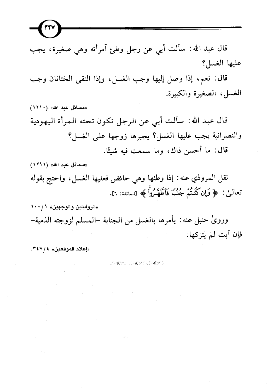 قال عبد اللَّه: سألت أبي عن الرجل تكون تحته المرأة اليهودية والنصرانية يجب عليها الغسل؟ يجبرها زوجها على الغسل؟