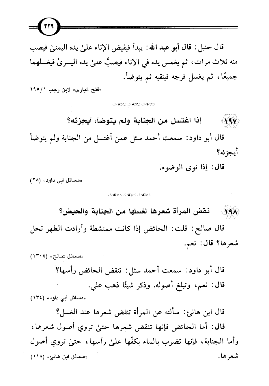 قال حنبل: قال أبو عبد اللَّه: يبدأ فيفيض الإناء على يده اليمنى فيصب منه ثلاث مرات، ثم يغمس يده في الإناء فيصبَّ على يده اليسرى فيغسلهما جميعًا، ثم يغسل فرجه فينقيه ثم يتوضأ.