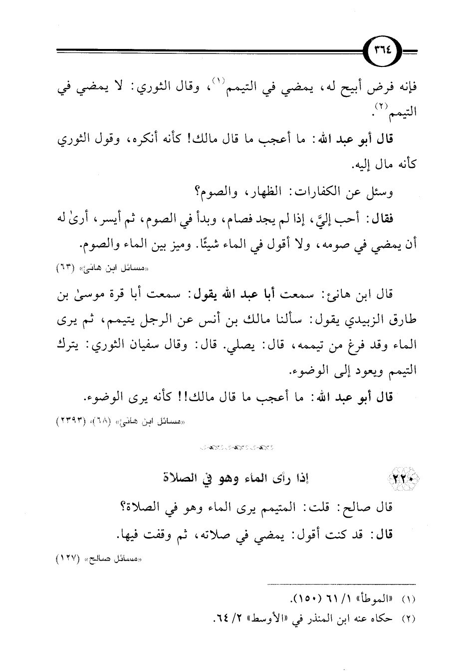 قال ابن هانئ: سمعت أبا عبد اللَّه يقول: سمعت أبا قرة موسى بن طارق الزبيدي يقول: سألنا مالك بن أنس عن الرجل يتيمم، ثم يرى الماء وقد فرغ من تيممه، قال: يصلي. قال: وقال سفيان الثوري: يترك التيمم ويعود إلى الوضوء.