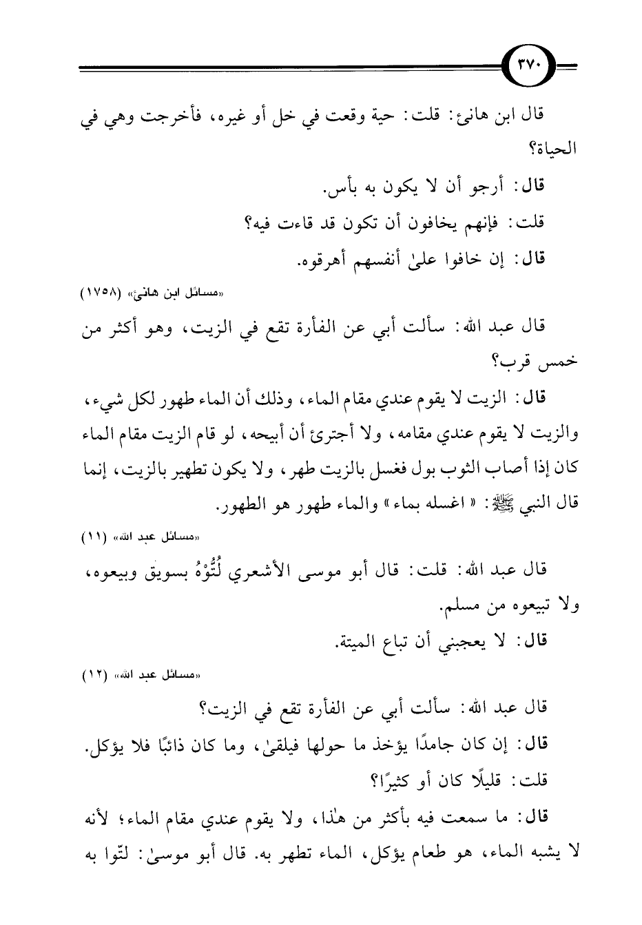 قال عبد اللَّه: سألت أبي عن الفأرة تقع في الزيت، وهو أكثر من خمس قرب؟