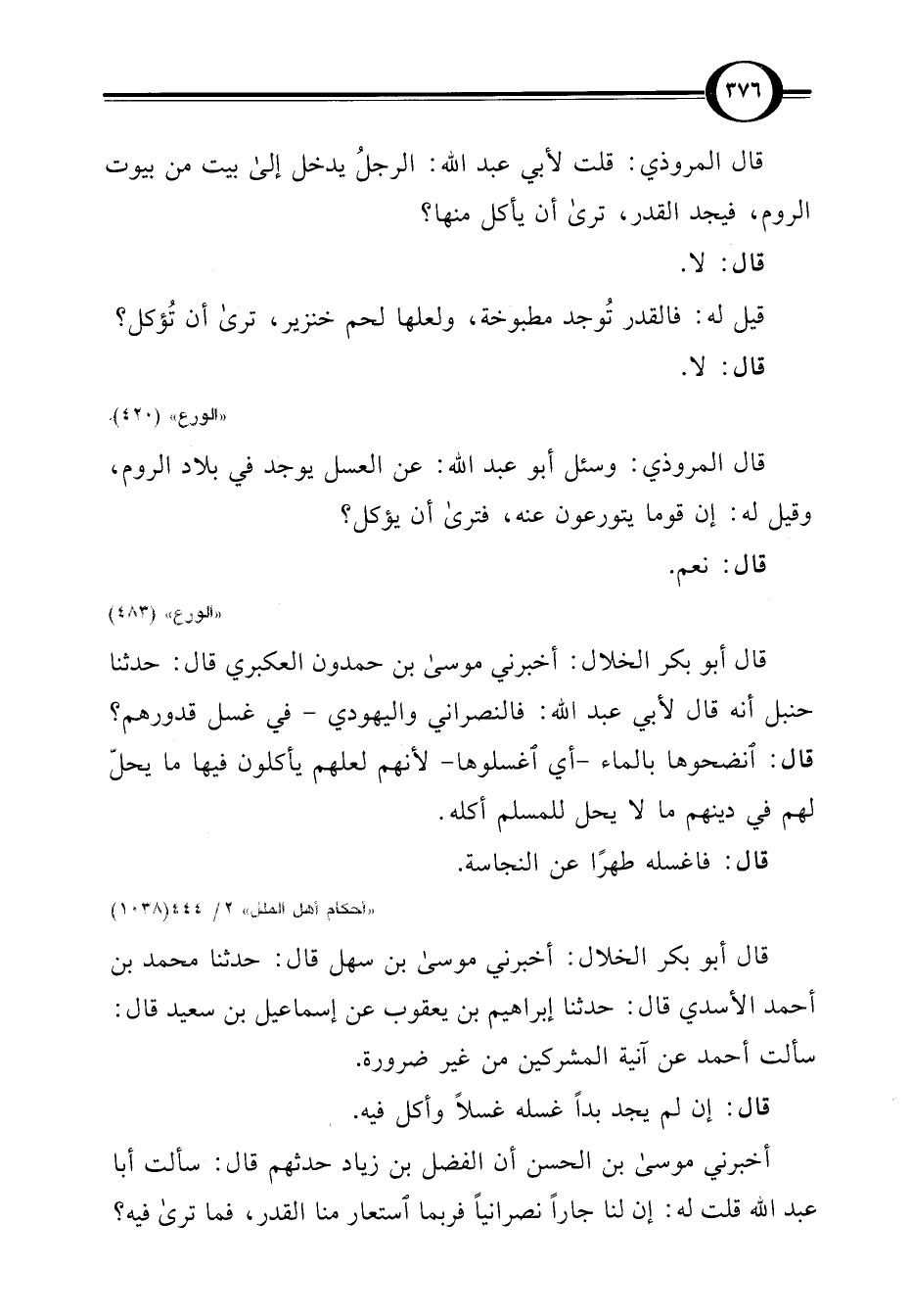 حنبل أنه قال لأبي عبد اللَّه: فالنصراني واليهودي -في غسل قدورهم؟ قال: انضحوها بالماء -أي اغسلوها- لأنهم لعلهم يأكلون فيها ما يحلّ