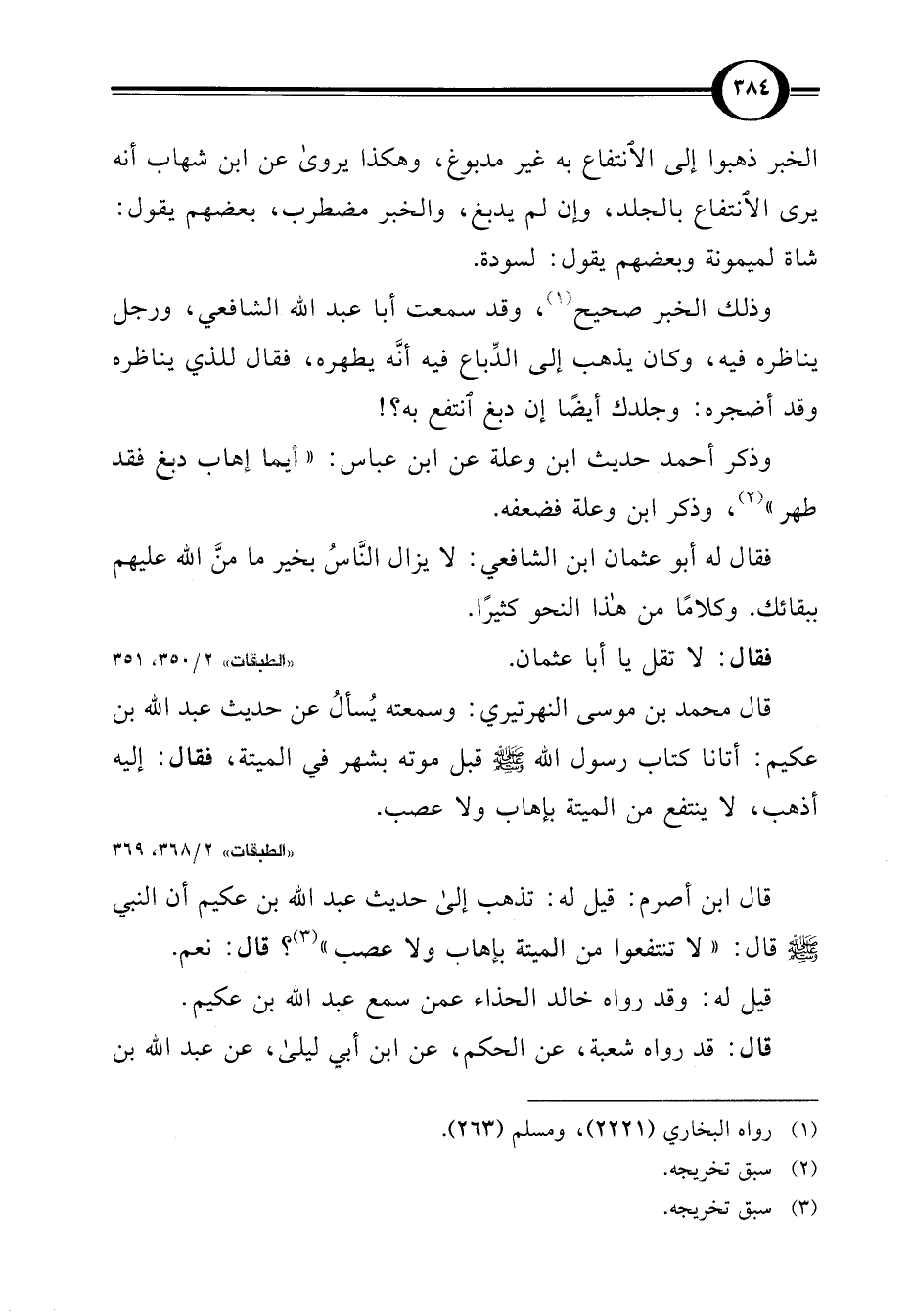 قال محمد بن موسى النهرتيري: وسمعته يُسألُ عن حديث عبد اللَّه بن عكيم: أتانا كتاب رسول اللَّه -صلى اللَّه عليه وسلم- قبل موته بشهر في الميتة، فقال: إليه أذهب، لا ينتفع من الميتة بإهاب ولا عصب.