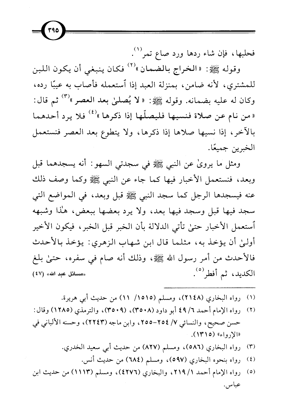 وقوله -صلى اللَّه عليه وسلم-: "الخراج بالضمان" (¬2) فكان ينبغي أن يكون اللبن للمشتري، لأنه ضامن، بمنزلة العبد إذا استعمله فأصاب به عيبًا رده، وكان له عليه بضمانه. وقوله -صلى اللَّه عليه وسلم-: "لا يُصلى بعد العصر" (¬3) ثم قال: "من نام عن صلاة فنسيها فليصلّها إذا ذكرها" (¬4) فلا يرد أحدهما بالآخر، إذا نسيها صلاها إذا ذكرها، ولا يتطوع بعد العصر فنستعمل الخبرين جميعًا.