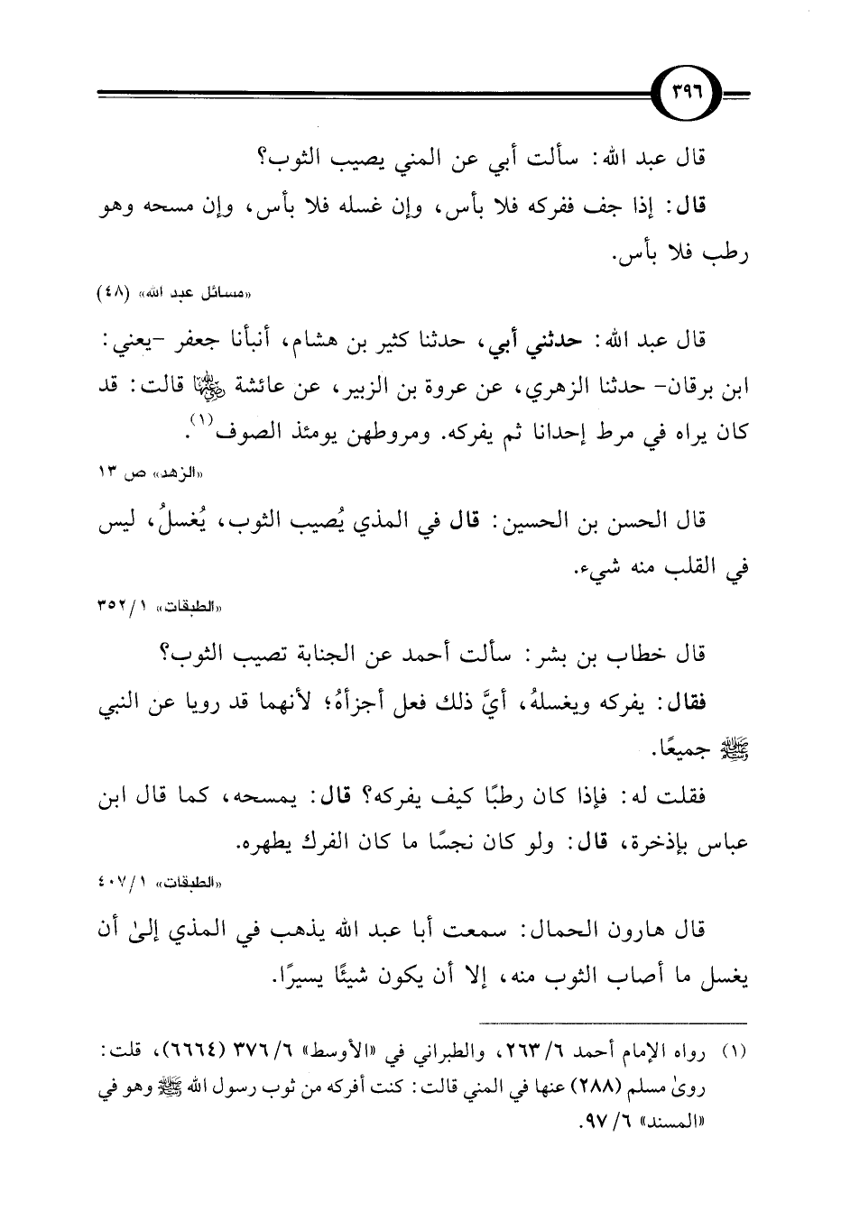 قال عبد اللَّه: حدثني أبي، حدثنا كثير بن هشام، أنبأنا جعفر -يعني: ابن برقان- حدثنا الزهري، عن عروة بن الزبير، عن عائشة -رضي اللَّه عنها- قالت: قد كان يراه في مرط إحدانا ثم يفركه. ومروطهن يومئذ الصوف (¬1).