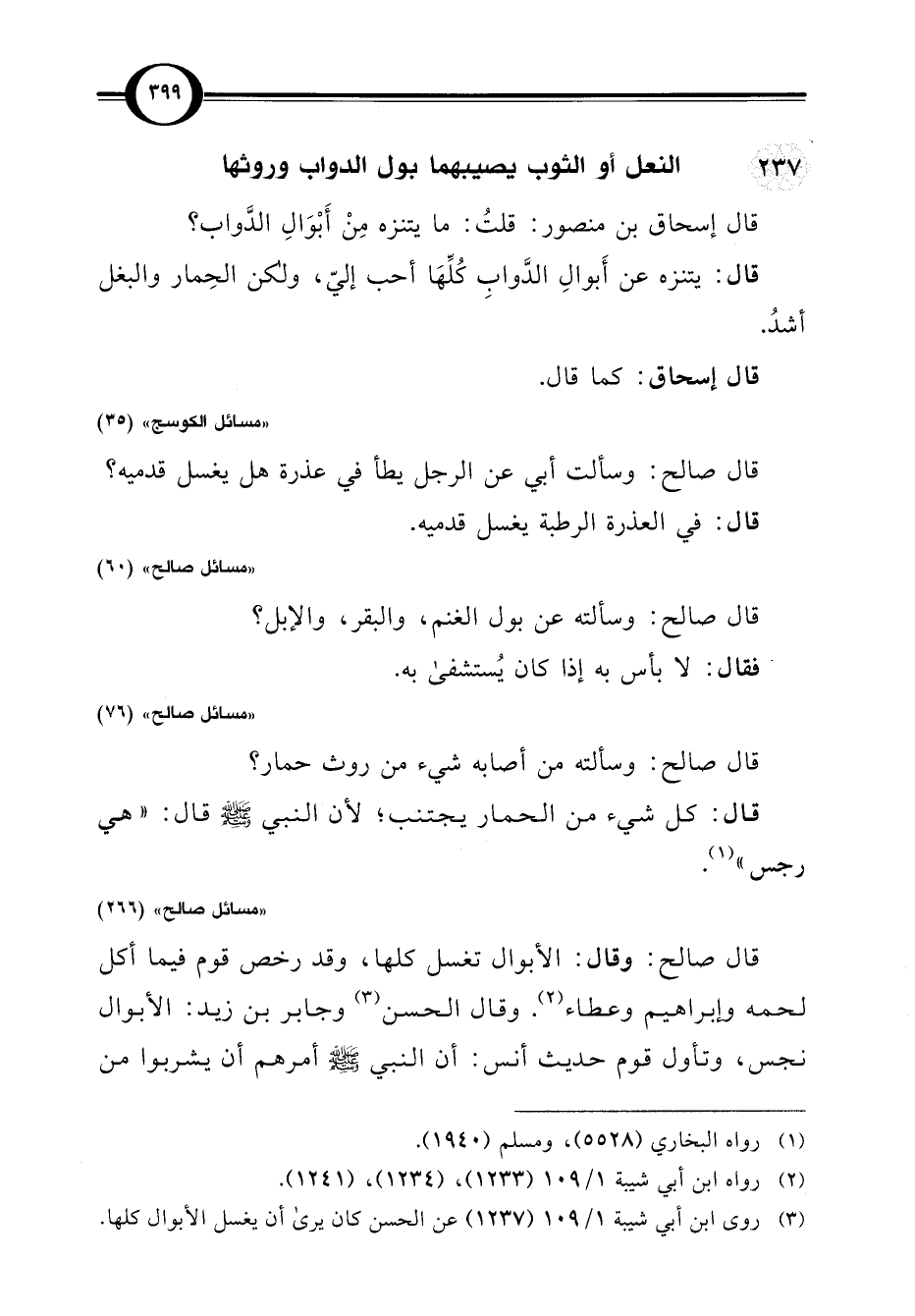 237 - النعل أو الثوب يصيبهما بول الدواب وروثها