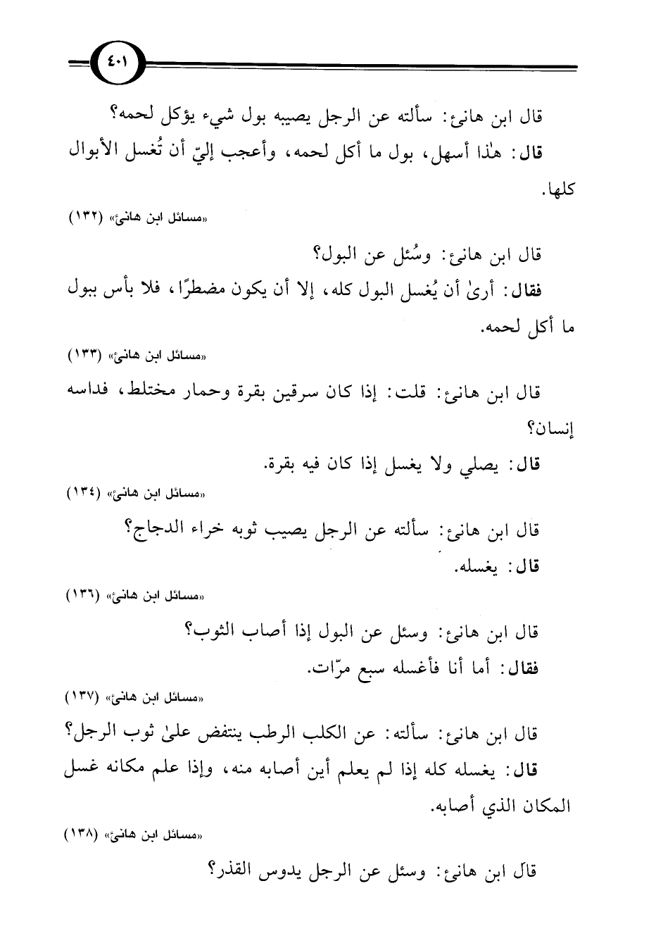 قال ابن هانئ: سألته عن الرجل يصيبه بول شيء يؤكل لحمه؟