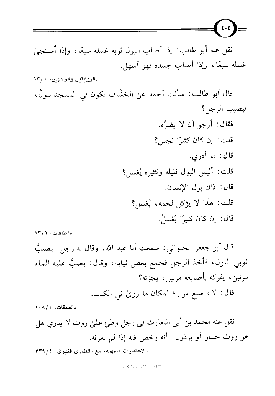 قال أبو جعفر الحلواني: سمعت أبا عبد اللَّه، وقال له رجل: يصيب ثوبي البول، فأخذ الرجل فجمع بعض ثيابه، وقال: يصبُّ عليه الماء مرتين، يفركه بأصابعه مرتين، يجزئه؟