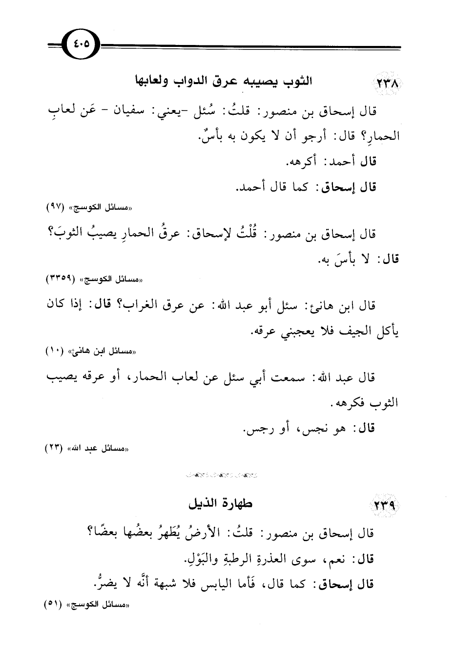 قال إسحاق بن منصور: قُلْتُ لإسحاق: عرقُ الحمارِ يصيبُ الثوبَ؟