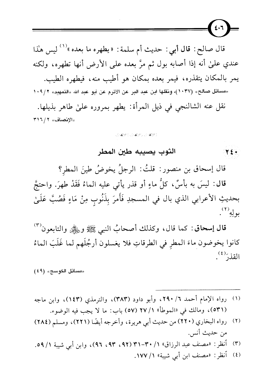 قال إسحاق: كما قال، وكذلك أصحابُ النبي -صلى اللَّه عليه وسلم- ورضي اللَّه عنهم والتابعون (¬3) كانوا يخوضون ماءَ المطرِ في الطرقاتِ فلا يغسلون أرجُلَهم لما غَلَبَ الماءُ القذرَ (¬4).