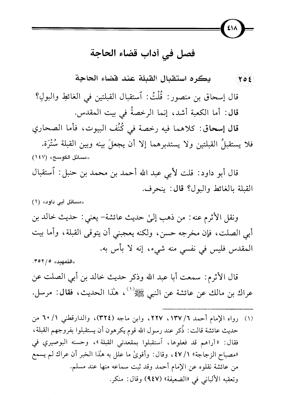 قال إسحاق بن منصور: قُلْتُ: استقبال القبلتين في الغائطِ والبولِ؟