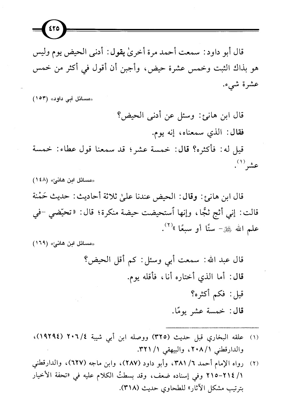 قال أبو داود: سمعت أحمد مرة أخرى يقول: أدنى الحيض يوم وليس هو بذاك الثبت وخمس عشرة حيض، وأجبن أن أقول في أكثر من خمس عشرة شيء.
