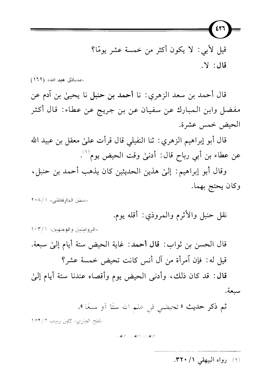 قال أحمد بن سعد الزهري: نا أحمد بن حنبل نا يحيى بن آدم عن مفضل وابن المبارك عن سفيان عن بن جريج عن عطاء: قال أكثر الحيض خمس عشرة.