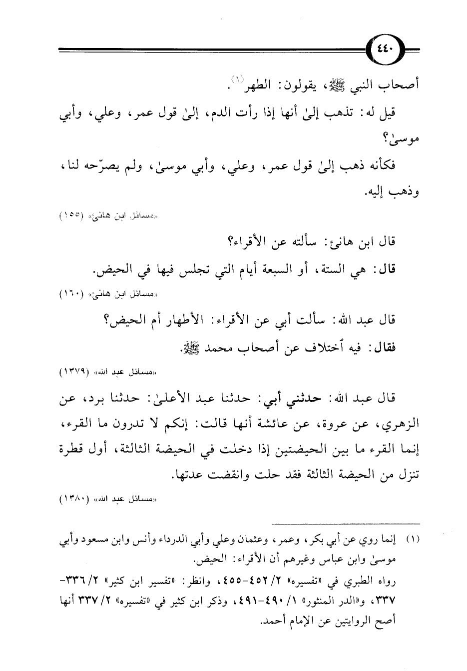 قال عبد اللَّه: سألت أبي عن الأقراء: الأطهار أم الحيض؟