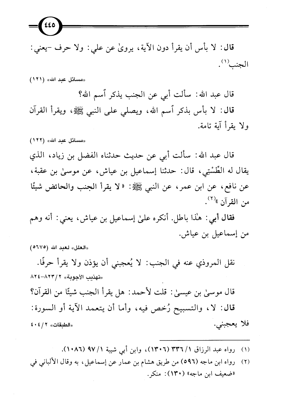 قال عبد اللَّه: سألت أبي عن حديث حدثناه الفضل بن زياد، الذي يقال له الطِّسْتِي، قال: حدثنا إسماعيل بن عياش، عن موسى بن عقبة، عن نافع، عن ابن عمر، عن النبي -صلى اللَّه عليه وسلم-: "لا يقرأ الجنب والحائض شيئًا من القرآن" (¬2).