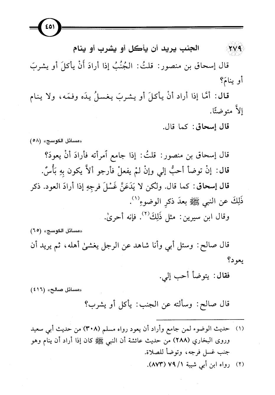 قال إسحاق بن منصور: قلتُ: الجُنُبُ إذا أرادَ أَنْ يأكلَ أو يشربَ أو ينامَ؟