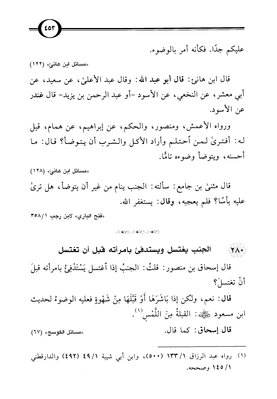 قال إسحاق بن منصور: قلتُ: الجنبُ إذا اغتسل يَسْتَدْفِئُ بامرأته قبلَ أنْ تغتسلَ؟