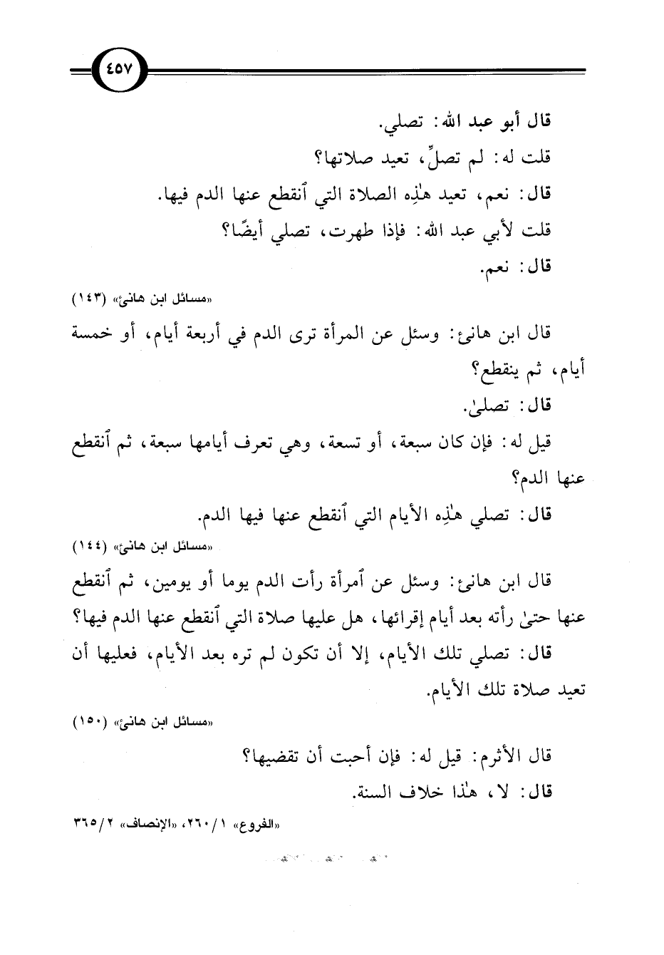 قال ابن هانئ: وسئل عن المرأة ترى الدم في أربعة أيام، أو خمسة أيام، ثم ينقطع؟