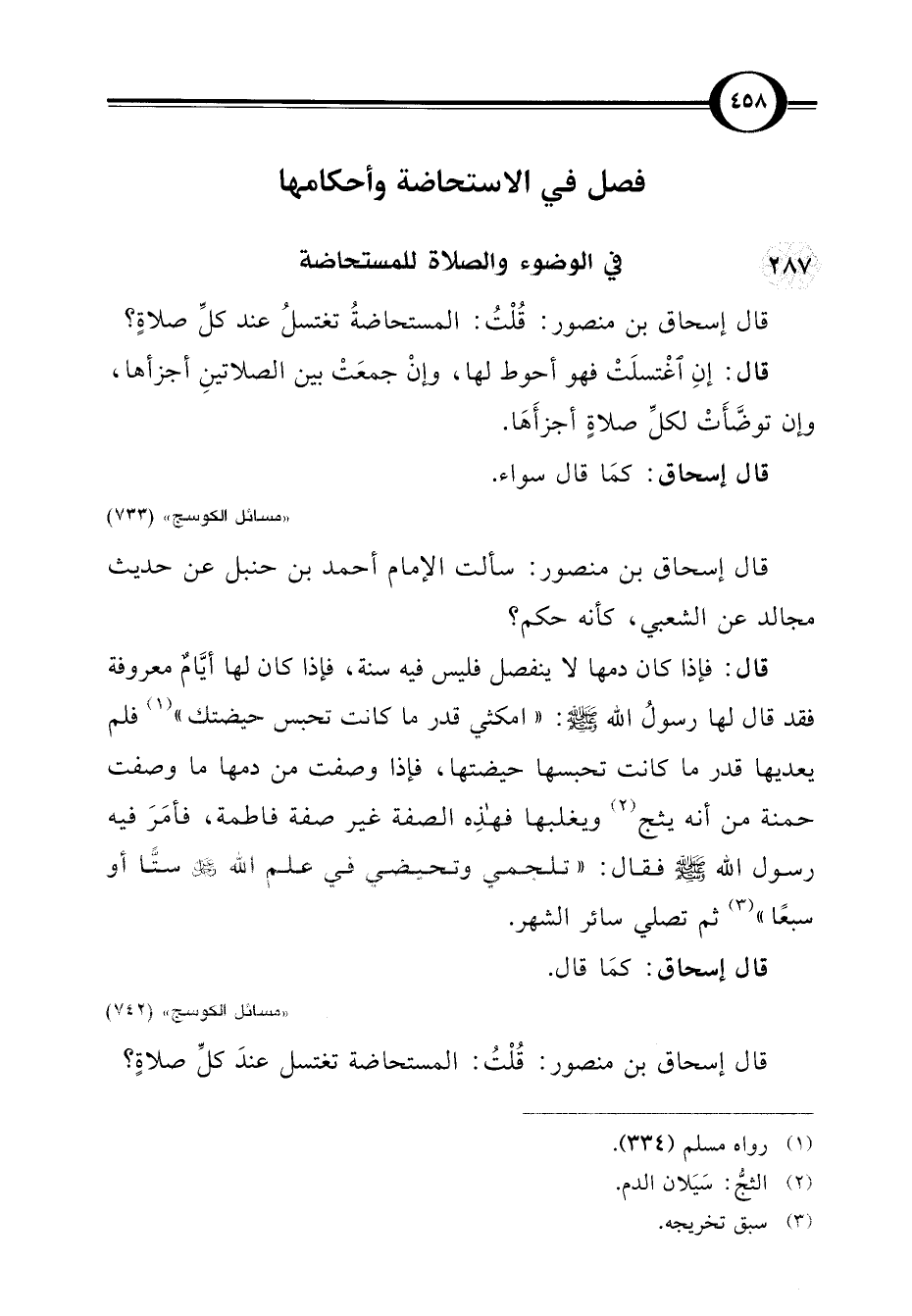 قال إسحاق بن منصور: قُلْتُ: المستحاضة تغتسل عندَ كلِّ صلاةٍ؟