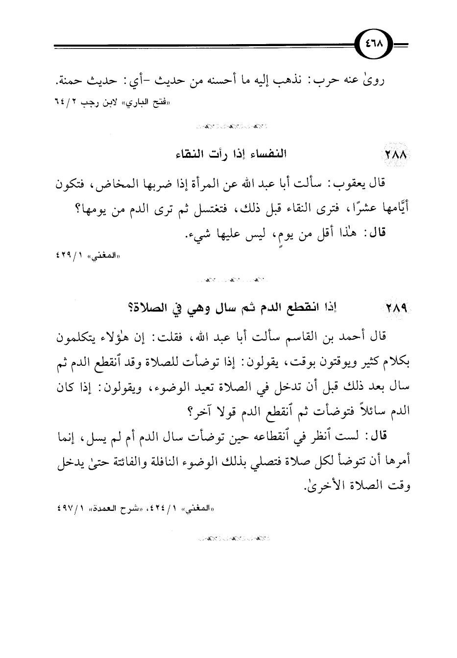 قال أحمد بن القاسم سألت أبا عبد اللَّه، فقلت: إن هؤلاء يتكلمون بكلام كثير ويوقتون بوقت، يقولون: إذا توضأت للصلاة وقد انقطع الدم ثم سال بعد ذلك قبل أن تدخل في الصلاة تعيد الوضوء، ويقولون: إذا كان الدم سائلًا فتوضأت ثم انقطع الدم قولا آخر؟