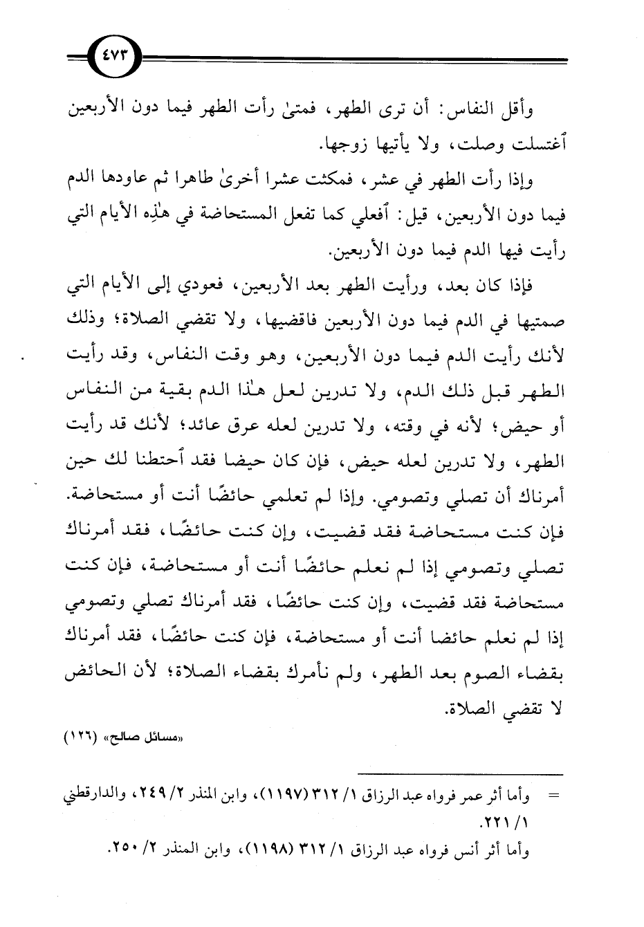 فإذا كان بعد، ورأيت الطهر بعد الأربعين، فعودي إلى الأيام التي صمتيها في الدم فيما دون الأربعين فاقضيها، ولا تقضي الصلاة؛ وذلك لأنك رأيت الدم فيما دون الأربعين، وهو وقت النفاس، وقد رأيت الطهر قبل ذلك الدم، ولا تدرين لعل هذا الدم بقية من النفاس أو؛ لأنه في وقته، ولا تدرين لعله عرق عائد؛ لأنك قد رأيت الطهر، ولا تدرين لعله حيض، فإن كان حيضا فقد احتطنا لك حين أمرناك أن تصلي وتصومي. وإذا لم تعلمي حائضًا أنت أو مستحاضة. فإن كنت مستحاضة فقد قضيت، وإن كنت حائضًا، فقد أمرناك تصلي وتصومي إذا لم نعلم حائضًا أنت أو مستحاضة، فإن كنت مستحاضة فقد قضيت، وإن كنت حائضًا، فقد أمرناك تصلي وتصومي إذا لم نعلم حائضًا أنت أو مستحاضة، فإن كنت حائضًا، فقد أمرناك بقضاء الصوم بعد الطهر، ولم نأمرك بقضاء الصلاة؛ لأن الحائض لا تقضي الصلاة.