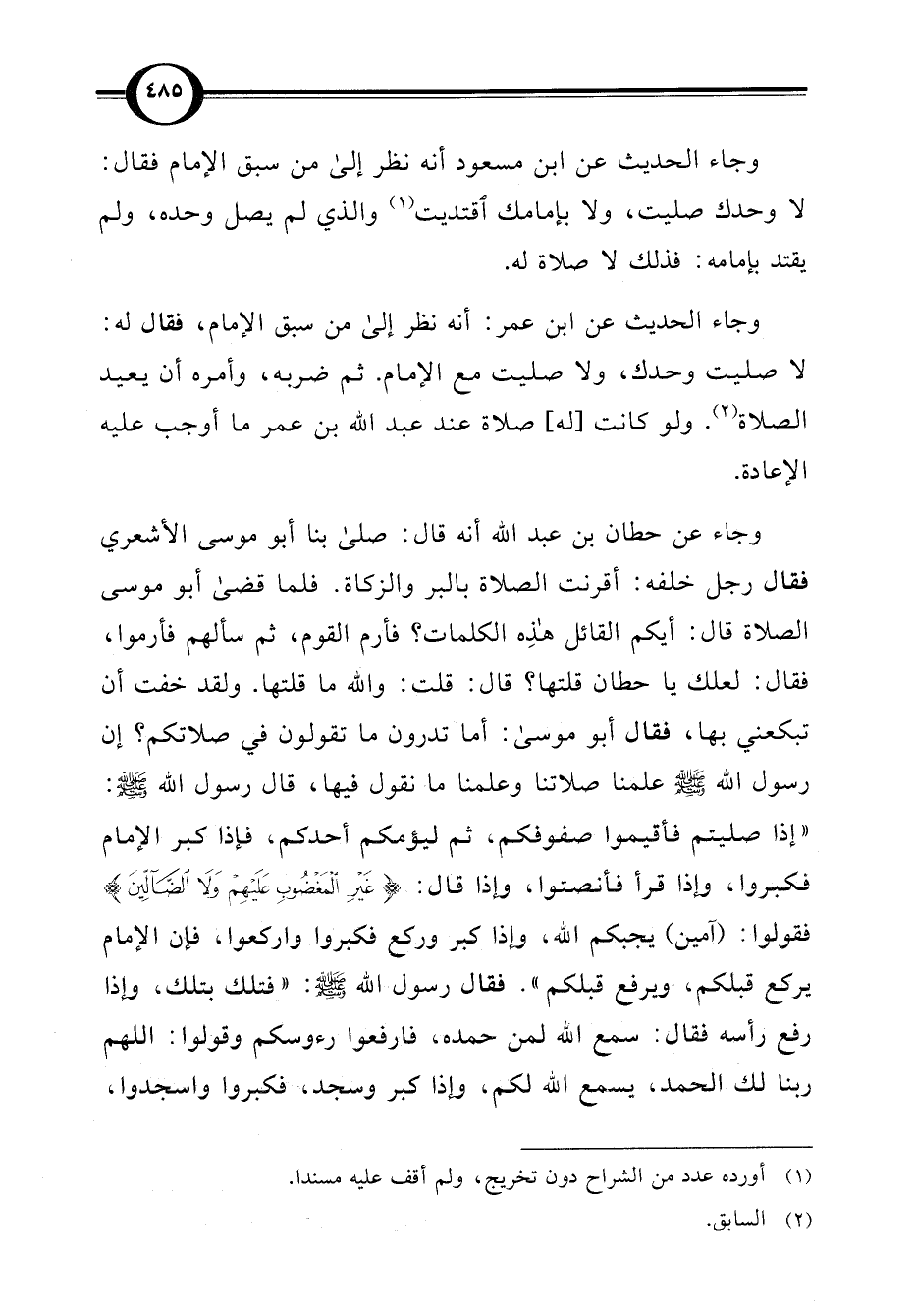 وجاء الحديث عن ابن مسعود أنه نظر إلى من سبق الإمام فقال: لا وحدك صليت، ولا بإمامك اقتديت (¬1) والذي لم يصل وحده، ولم يقتد بإمامه: فذلك لا صلاة له.