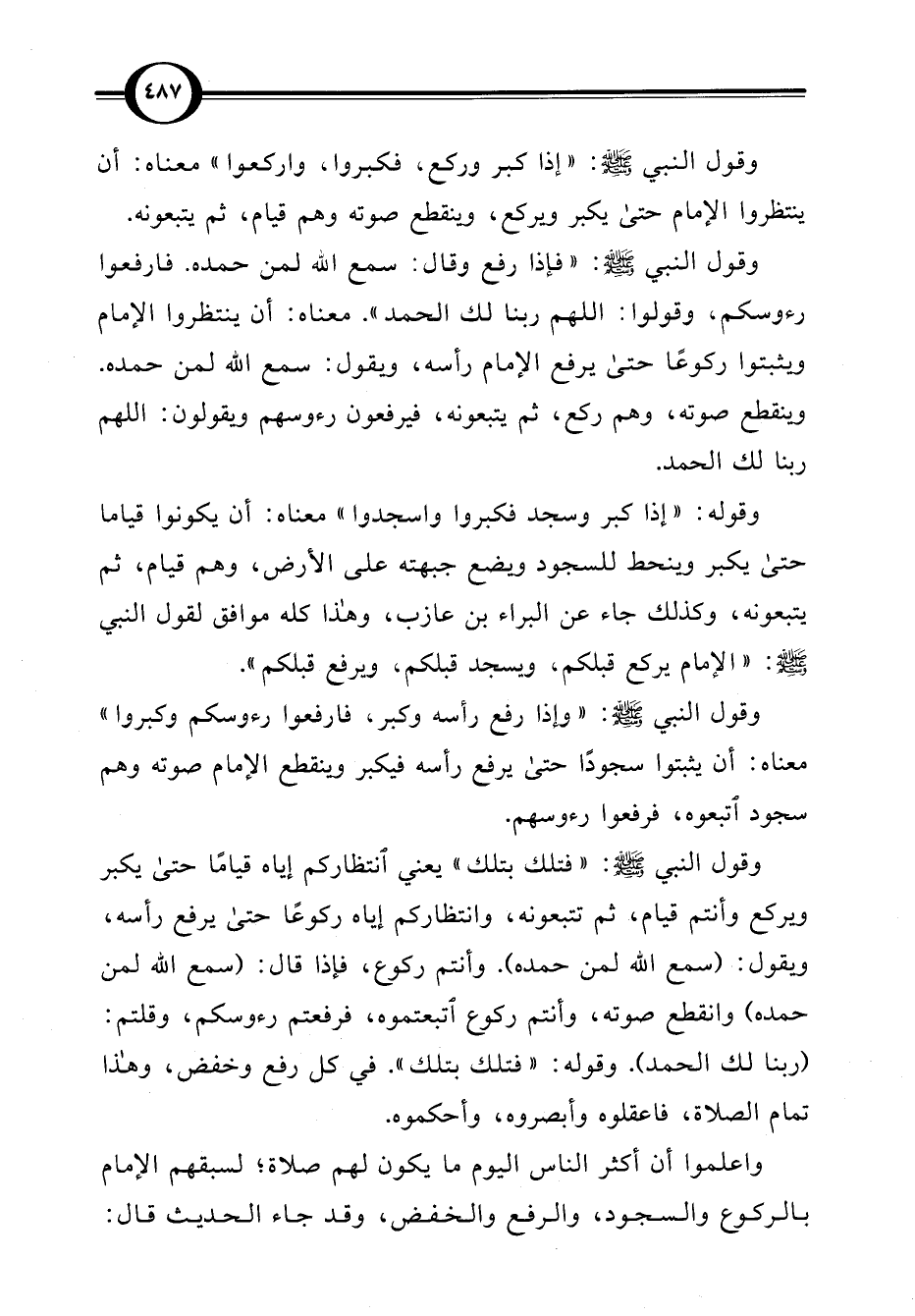 واعلموا أن أكثر الناس اليوم ما يكون لهم صلاة؛ لسبقهم الإمام بالركوع والسجود، والرفع والخفض، وقد جاء الحديث قال: