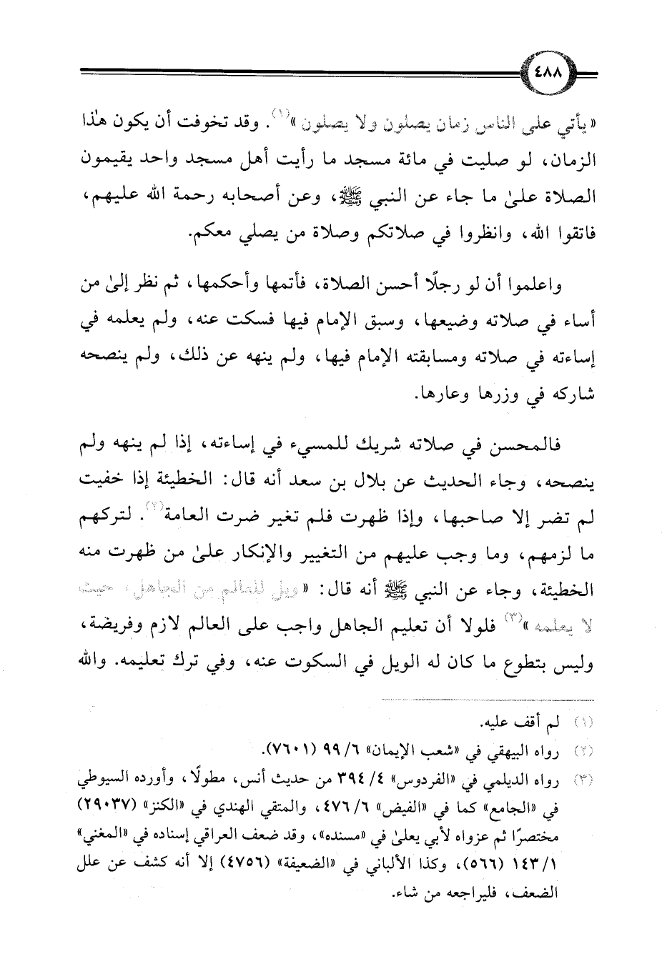 واعلموا أن لو رجلًا أحسن الصلاة، فأتمها وأحكمها، ثم نظر إلى من أساء في صلاته وضيعها، وسبق الإمام فيها فسكت عنه، ولم يعلمه في إساءته في صلاته ومسابقته الإمام فيها، ولم ينهه عن ذلك، ولم ينصحه شاركه في وزرها وعارها.