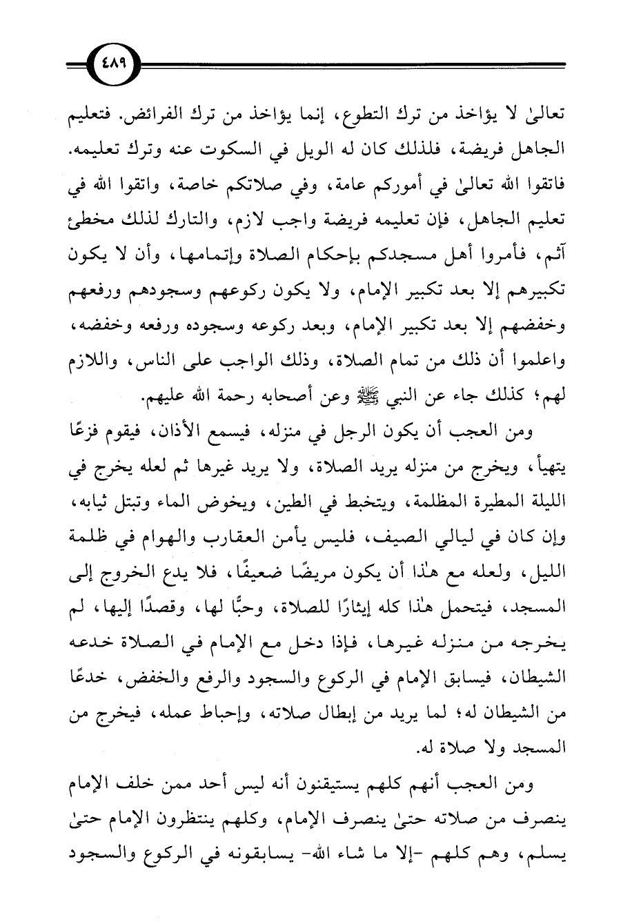 تعالى لا يؤاخذ من ترك التطوع، إنما يؤاخذ من ترك الفرائض. فتعليم الجاهل فريضة، فلذلك كان له الويل في السكوت عنه وترك تعليمه. فاتقوا اللَّه تعالى في أموركم عامة، وفي صلاتكم خاصة، واتقوا اللَّه في تعليم الجاهل، فإن تعليمه فريضة واجب لازم، والتارك لذلك مخطئ آثم، فأمروا أهل مسجدكم بإحكام الصلاة وإتمامها، وأن لا يكون تكبيرهم إلا بعد تكبير الإمام، ولا يكون ركوعهم وسجودهم ورفعهم وخفضهم إلا بعد تكبير الإمام، وبعد ركوعه وسجوده ورفعه وخفضه، واعلموا أن ذلك من تمام الصلاة، وذلك الواجب على الناس، واللازم لهم؛ كذلك جاء عن النبي -صلى اللَّه عليه وسلم- وعن أصحابه رحمة اللَّه عليهم.