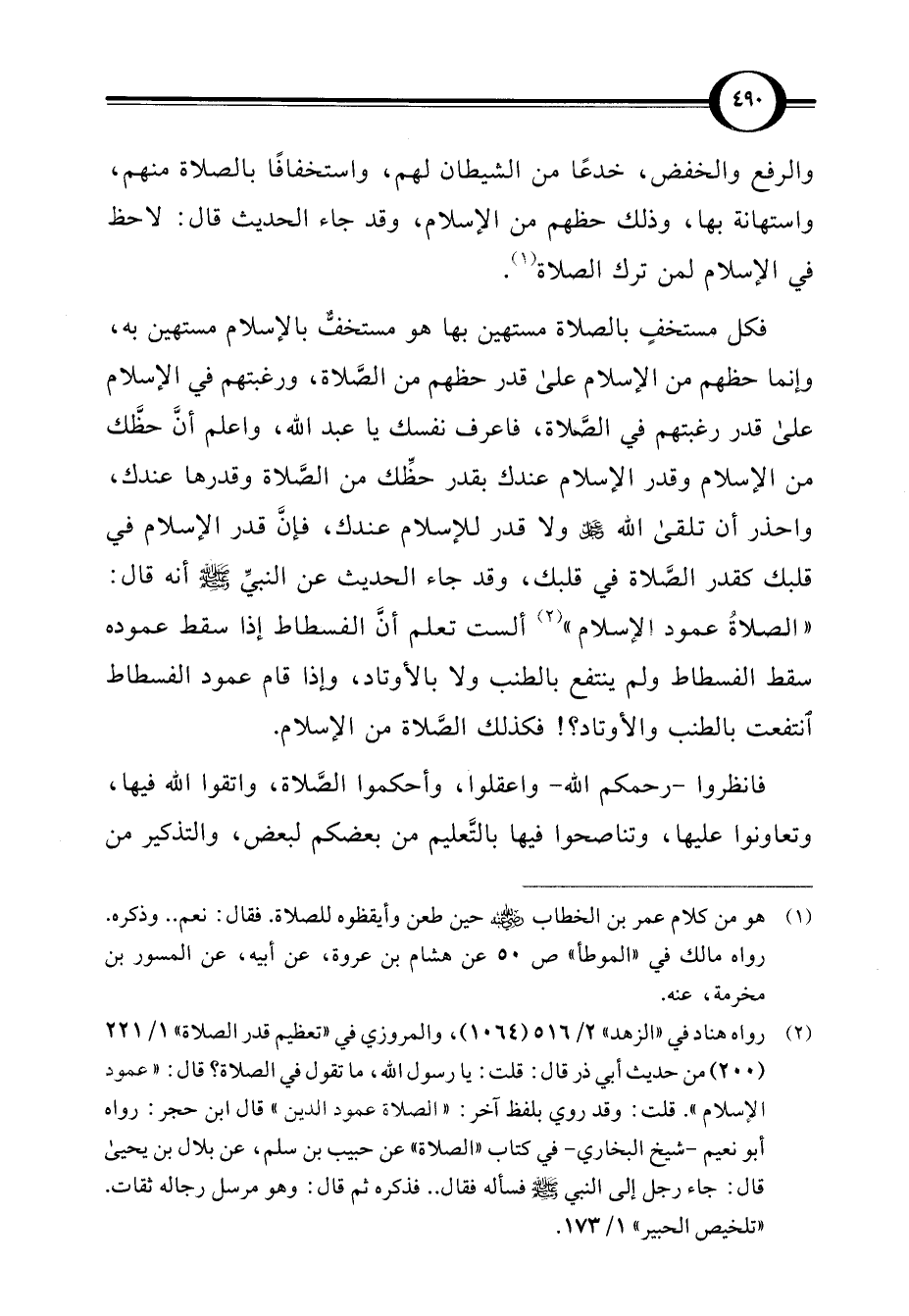 فكل مستخفٍ بالصلاة مستهين بها هو مستخفٌّ بالإسلام مستهين به، وإنما حظهم من الإسلام على قدر حظهم من الصَّلاة، ورغبتهم في الإسلام على قدر رغبتهم في الصَّلاة، فاعرف نفسك يا عبد اللَّه، واعلم أنَّ حظَّك من الإسلام وقدر الإسلام عندك بقدر حظِّك من الصَّلاة وقدرها عندك، واحذر أن تلقى اللَّه ولا قدر للإسلام عندك، فإنَّ قدر الإسلام في قلبك كقدر الصَّلاة في قلبك، وقد جاء الحديث عن النبيِّ صلى اللَّه عليه وسلم أنه قال: "الصلاةُ عمود الإسلام" (¬2) ألست تعلم أنَّ الفسطاط إذا سقط عموده سقط الفسطاط ولم ينتفع بالطنب ولا بالأوتاد، وإذا قام عمود الفسطاط انتفعت بالطنب والأوتاد؟ ! فكذلك الصَّلاة من الإسلام.