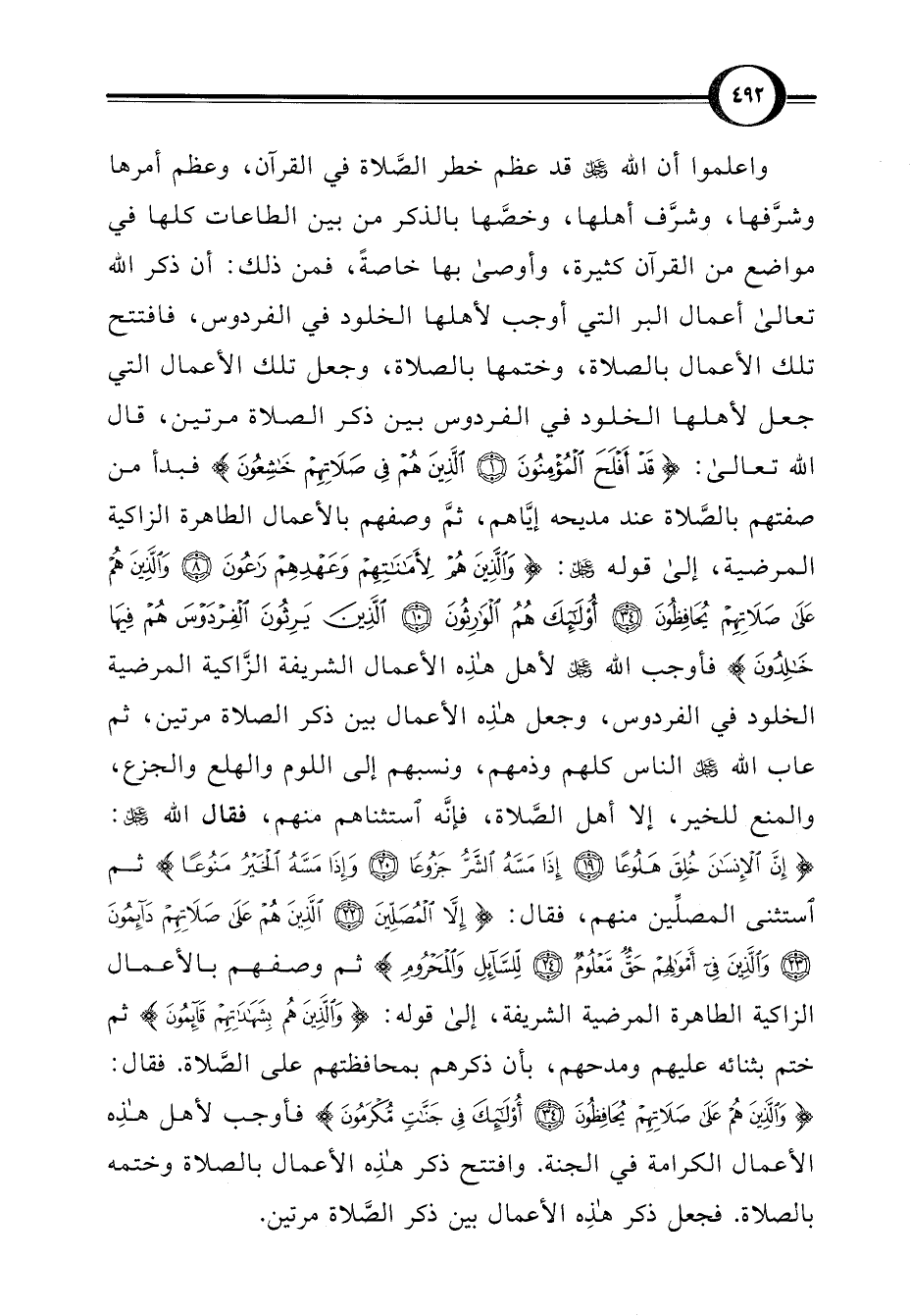 واعلموا أن اللَّه عز وجل قد عظم خطر الصَّلاة في القرآن، وعظم أمرها وشرَّفها، وشرَّف أهلها، وخصَّها بالذكر من بين الطاعات كلها في مواضع من القرآن كثيرة، وأوصى بها خاصةً، فمن ذلك: أن ذكر اللَّه تعالى أعمال البر التي أوجب لأهلها الخلود في الفردوس، فافتتح تلك الأعمال بالصلاة، وختمها بالصلاة، وجعل تلك الأعمال التي جعل لأهلها الخلود في الفردوس بين ذكر الصلاة مرتين، قال اللَّه تعالى: {قَدْ أَفلَحَ الْمُؤْمِنُونَ (1) الَّذِينَ هُمْ فِي صَلَاتِهِمْ خَاشِعُونَ} فبدأ من صفتهم بالصَّلاة عند مديحه إيَّاهم، ثمَّ وصفهم بالأعمال الطاهرة الزاكية المرضية، إلى قوله عَزَّ وَجَلَّ: {وَالَّذِينَ هُمْ لِأَمَانَاتِهِمْ وَعَهْدِهِمْ رَاعُونَ (8) وَالَّذِينَ هُمْ عَلَى صَلَوَاتِهِمْ يُحَافِظُونَ (9) أُولَئِكَ هُمُ الْوَارِثُونَ (10) الَّذِينَ يَرِثُونَ الْفِرْدَوْسَ هُمْ فِيهَا خَالِدُونَ (11)} فأوجب اللَّه عَزَّ وَجَلَّ لأهل هذِه الأعمال الشريفة الزَّاكية المرضية الخلود في الفردوس، وجعل هذِه الأعمال بين ذكر الصلاة مرقين، ثم عاب اللَّه عَزَّ وَجَلَّ الناس كلهم وذمهم، ونسبهم إلى اللوم والهلع والجزع، والمنع للخير، إلا أهل الصَّلاة، فإنَّه استثناهم منهم، فقال اللَّه عَزَّ وَجَلَّ: {إِنَّ الْإِنْسَانَ خُلِقَ هَلُوعًا (19) إِذَا مَسَّهُ الشَّرُّ جَزُوعًا (20) وَإِذَا مَسَّهُ الْخَيْرُ مَنُوعًا (21)} ثم استثنى المصلِّين منهم، فقال: {إِلَّا الْمُصَلِّينَ (22) الَّذِينَ هُمْ عَلَى صَلَاتِهِمْ دَائِمُونَ (23) وَالَّذِينَ فِي أَمْوَالِهِمْ حَقٌّ مَعْلُومٌ (24) لِلسَّائِلِ وَالْمَحْرُومِ (25)} ثم وصفهم بالأعمال الزاكية الطاهرة المرضية الشريفة، إلى قوله: {وَالَّذِينَ هُمْ بِشَهَادَاتِهِمْ قَائِمُونَ (33)} ثم ختم بثنائه عليهم ومدحهم، بأن ذكرهم بمحافظتهم على الصَّلاة. فقال: {وَالَّذِينَ هُمْ عَلَى صَلَاتِهِمْ يُحَافِظُونَ (34) أُولَئِكَ فِي جَنَّاتٍ مُكْرَمُونَ (35)} فأوجب لأهل هذه الأعمال الكرامة في الجنة. وافتتح ذكر هذِه الأعمال بالصلاة وختمه بالصلاة. فجعل ذكر هذِه الأعمال بين ذكر الصَّلاة مرتين.