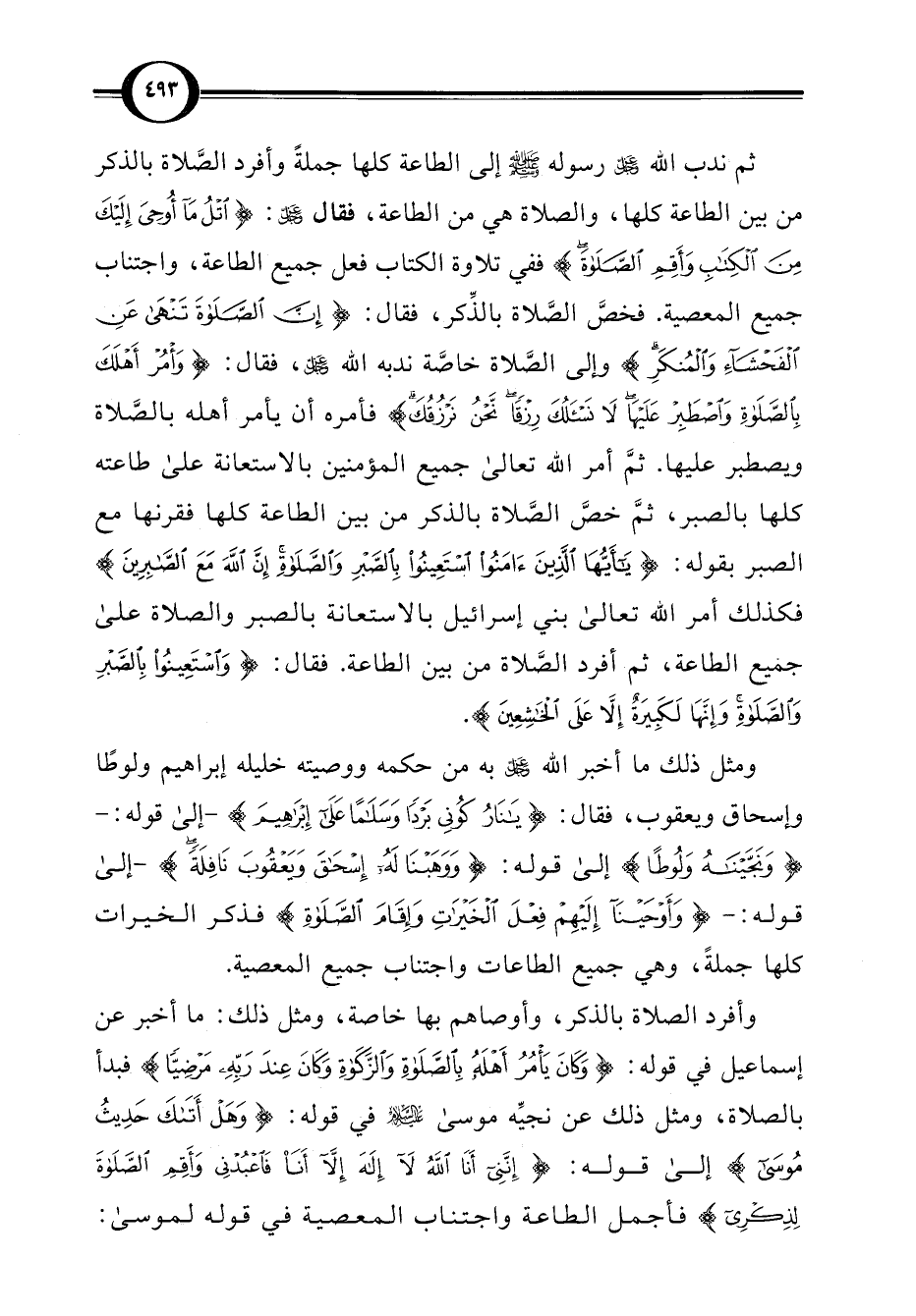 ثم ندب اللَّه عَزَّ وَجَلَّ رسوله -صلى اللَّه عليه وسلم- إلى الطاعة كلها جملةً وأفرد الصَّلاة بالذكر من بين الطاعة كلها، والصلاة هي من الطاعة، فقال عَزَّ وَجَلَّ: {اتْلُ مَا أُوحِيَ إِلَيْكَ مِنَ الْكِتَابِ وَأَقِمِ الصَّلَاةَ} ففي تلاوة الكتاب فعل جميع الطاعة، واجتناب جميع المعصية. فخصَّ الصَّلاة بالذِّكر، فقال: {إِنَّ الصَّلَاةَ تَنْهَى عَنِ الْفَحْشَاءِ وَالْمُنْكَرِ} وإلى الصَّلاة خاصَّة ندبه اللَّه عَزَّ وَجَلَّ، فقال: {وَأْمُرْ أَهْلَكَ بِالصَّلَاةِ وَاصْطَبِرْ عَلَيْهَا لَا نَسْأَلُكَ رِزْقًا نَحْنُ نَرْزُقُكَ} فأمره أن يأمر أهله بالصَّلاة ويصطبر عليها. ثمَّ أمر اللَّه تعالى جميع المؤمنين بالاستعانة على طاعته كلها بالصبر، ثمَّ خصَّ الصَّلاة بالذكر من بين الطاعة كلها فقرنها مع الصبر بقوله: {يَاأَيُّهَا الَّذِينَ آمَنُوا اسْتَعِينُوا بِالصَّبْرِ وَالصَّلَاةِ إِنَّ اللَّهَ مَعَ الصَّابِرِينَ (153)} فكذلك أمر اللَّه تعالى بني إسرائيل بالاستعانة بالصبر والصلاة على جميع الطاعة، ثم أفرد الصَّلاة من بين الطاعة. فقال: {وَاسْتَعِينُوا بِالصَّبْرِ وَالصَّلَاةِ وَإِنَّهَا لَكَبِيرَةٌ إِلَّا عَلَى الْخَاشِعِينَ (45)}.