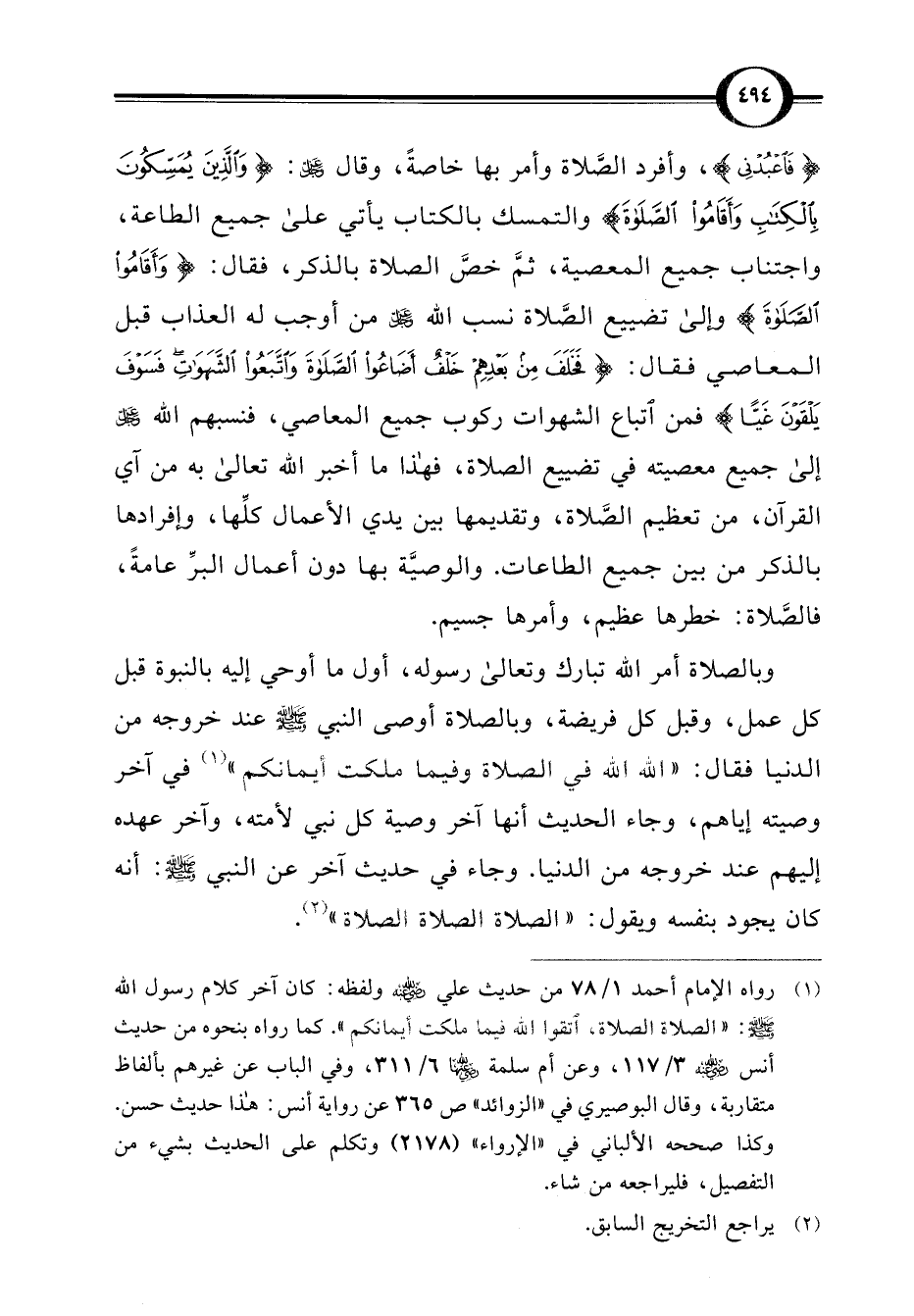 (¬1) رواه الإمام أحمد 1/ 78 من حديث علي -رضي اللَّه عنه- ولفظه: كان آخر كلام رسول اللَّه -صلى اللَّه عليه وسلم-: "الصلاة الصلاة، اتقوا اللَّه فيما ملكت أيمانكم". كما رواه بنحوه من حديث أنس -رضي اللَّه عنه-3/ 117، وعن أم سلمة -رضي اللَّه عنهما- 6/ 311، وفي الباب عن غيرهم بألفاظ متقاربة، وقال البوصيري في "الزوائد" ص 365 عن رواية أنس: هذا حديث حسن. وكذا صححه الألباني في "الإرواء" (2178) وتكلم على الحديث بشيء من التفصيل، فليراجعه من شاء.